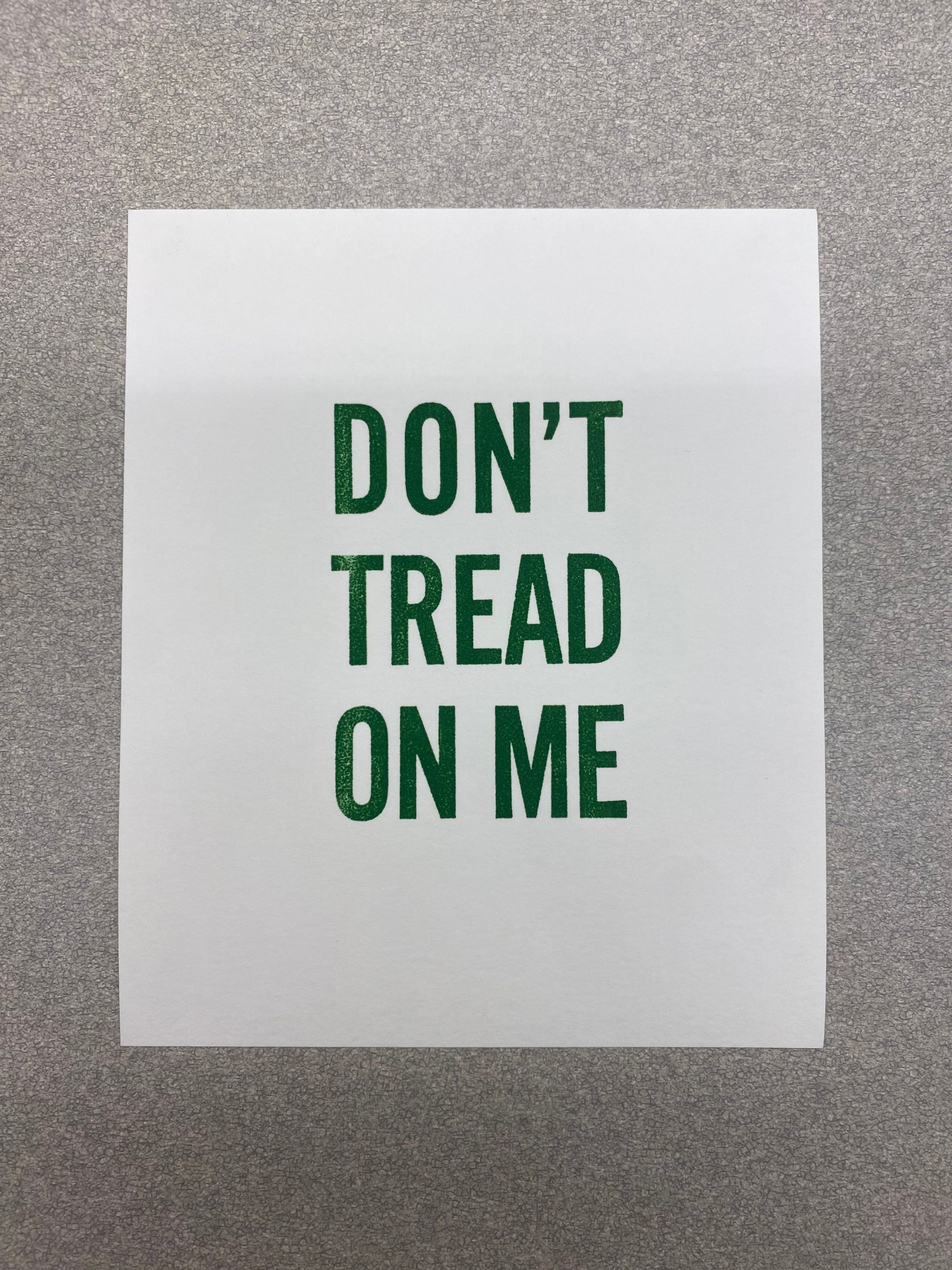 A small vertically oriented print of a green phrase claiming "Don't Tread On Me." The print is minimalistic in presentation but direct in messaging through the all capital letters.Collection