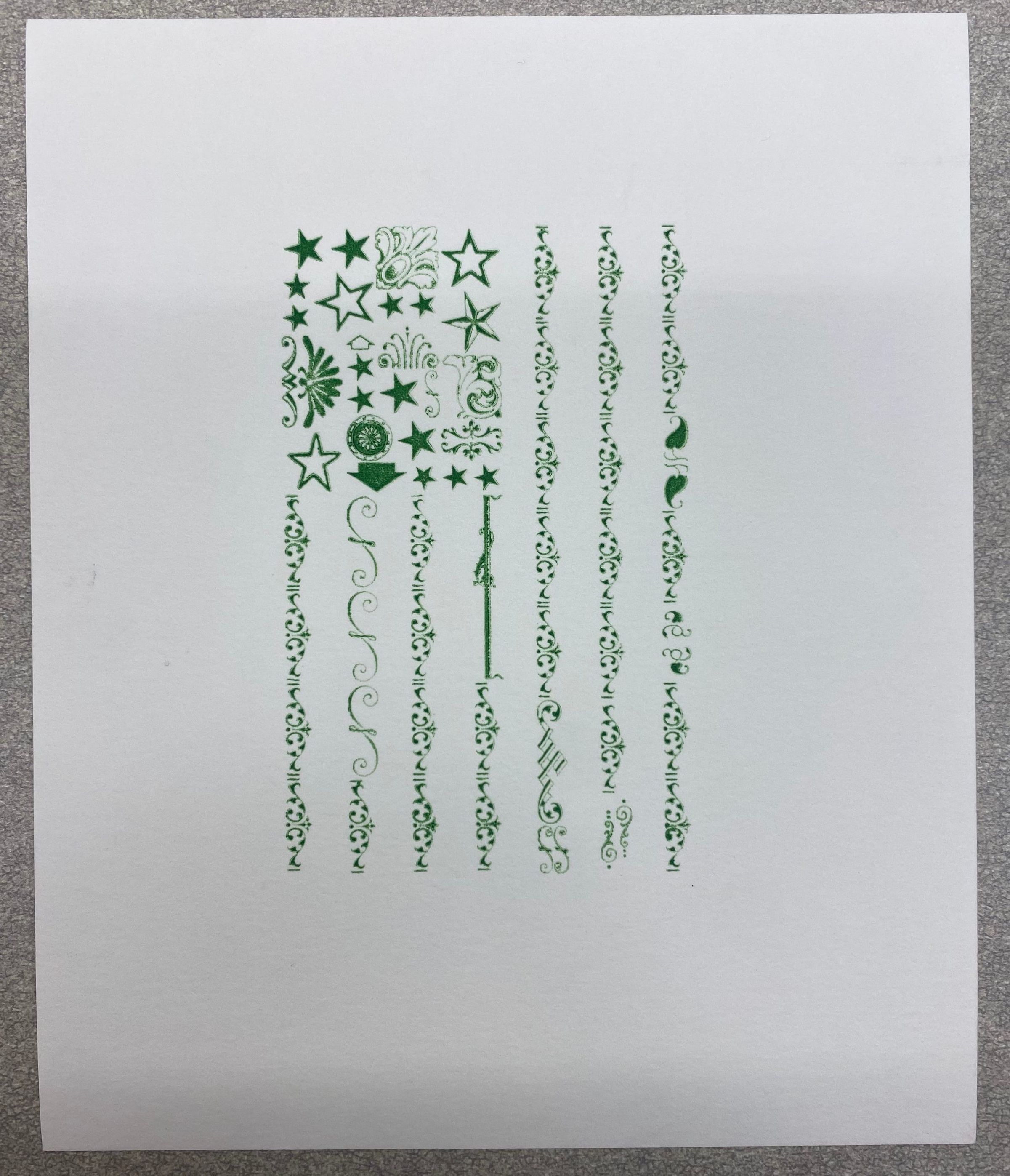 A small vertically oriented print that is reminiscent of a green American flag. Instead of typical stars and stripes, the artist utilized an assortments of different shapes and patterns to create the impression of an American flag that points downward.Collection