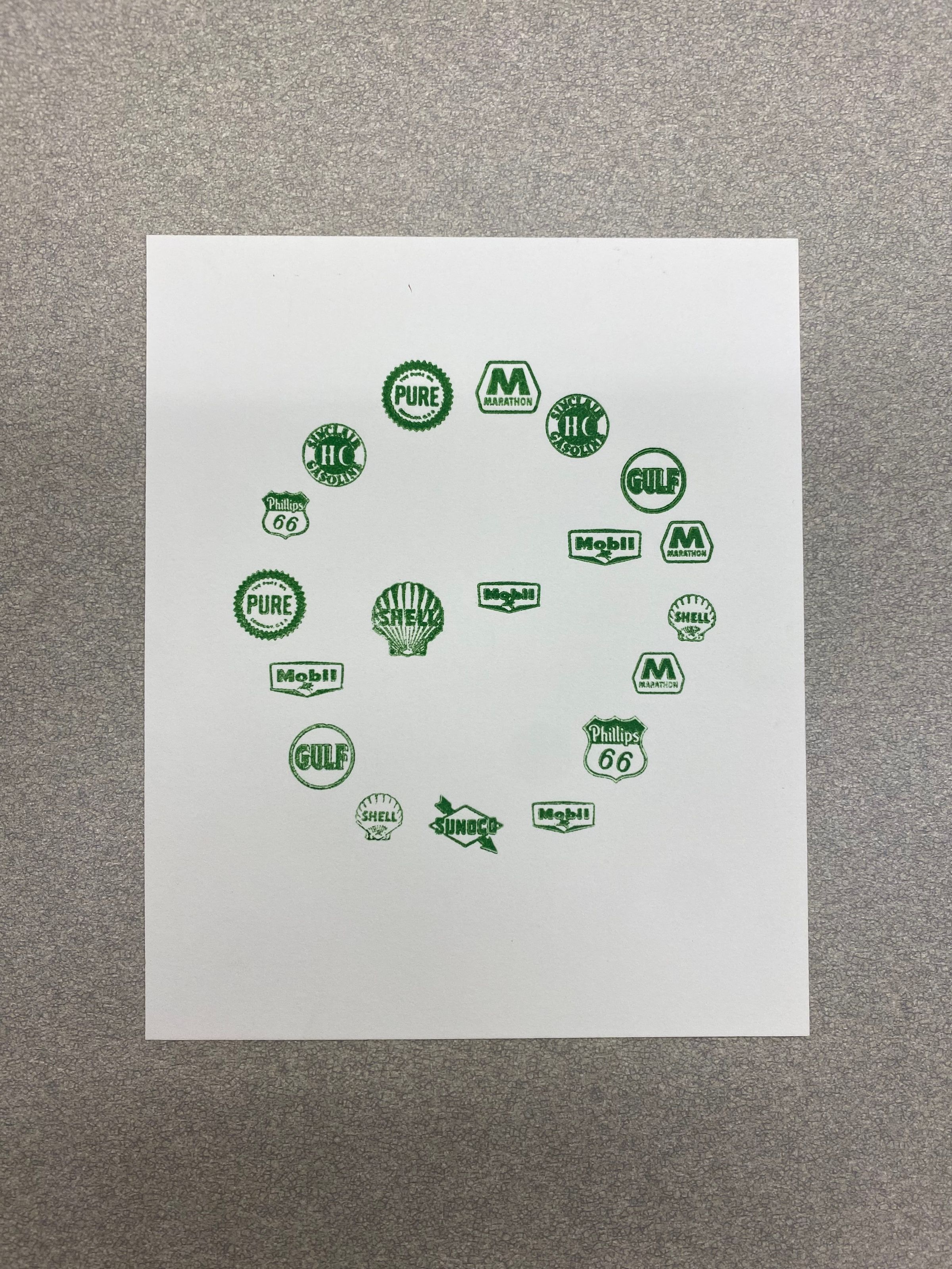 A small vertically oriented print presenting many gas company logos arrange in a circle with a figment line going through it. The color of the logos are done in green.Collection