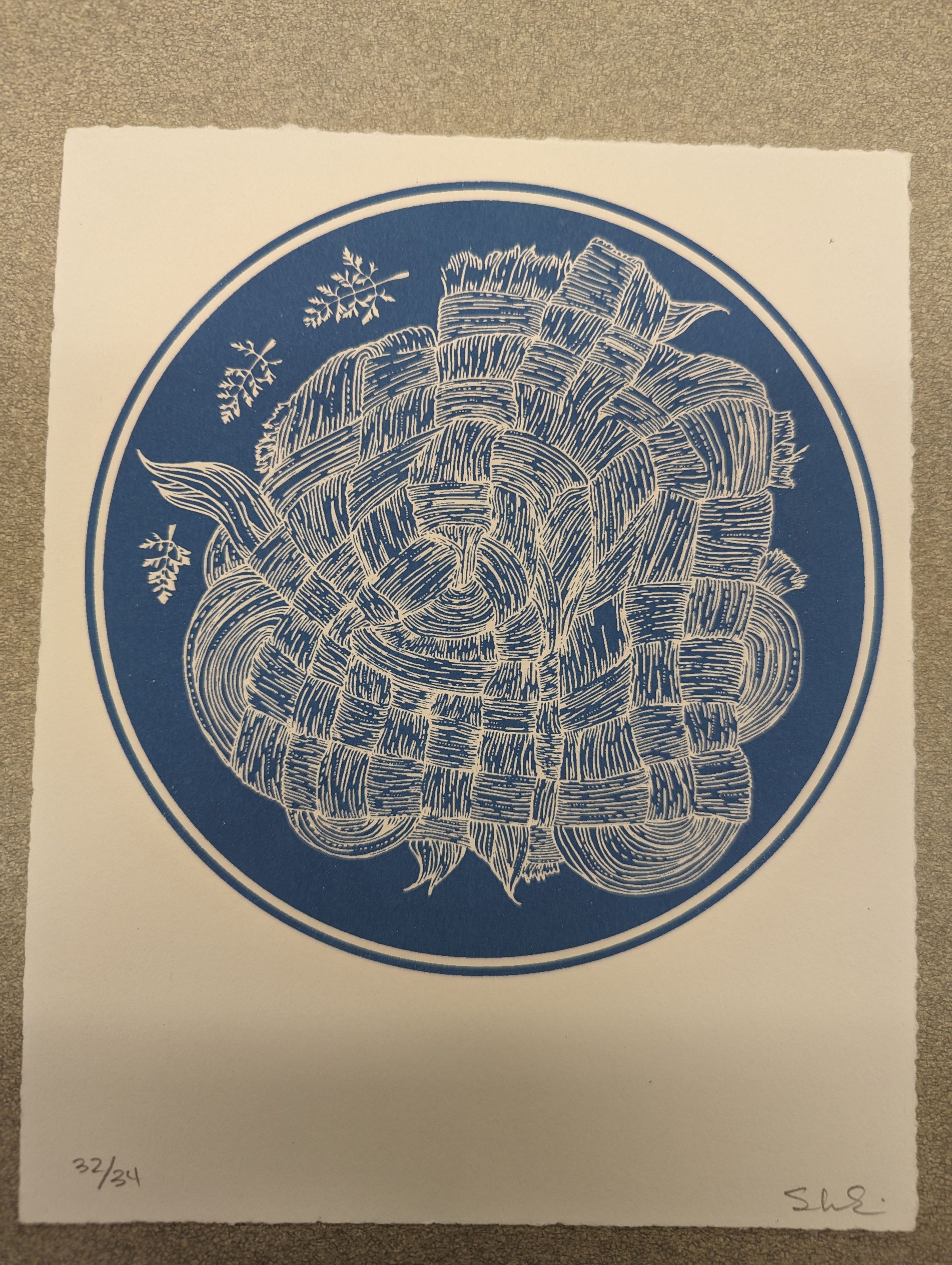 A small print showing a braided, knotted ball of fibers sketched out in white contours from a rimmed blue circle, with three plant motifs near its top left.Context