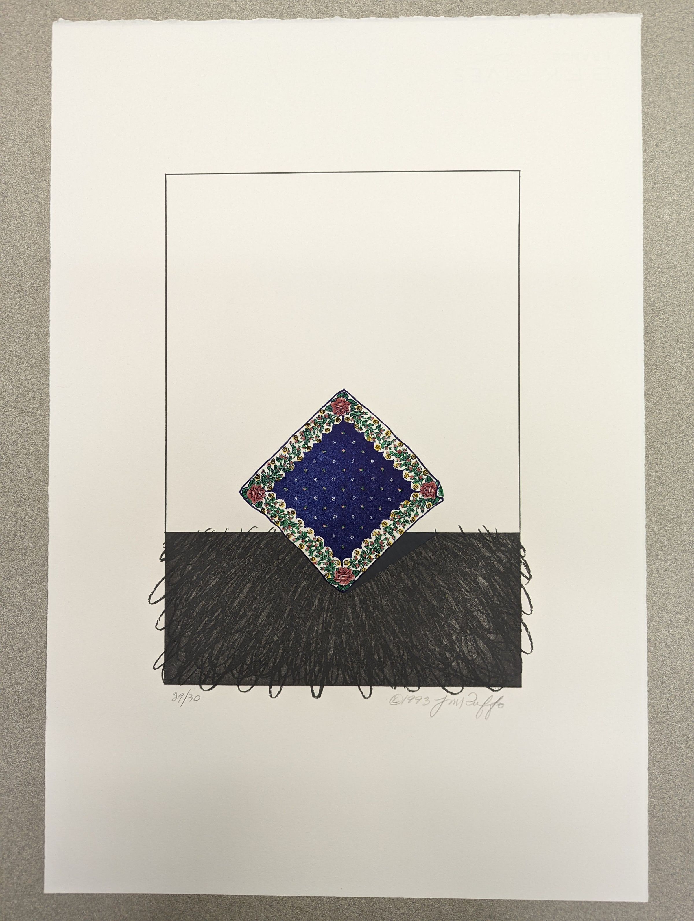 A large screenprint of a rectangular contour with its bottom third filled in with a black, scribbly background. Over the edge of the background and centered is a square diamond shape; a border of flowers with a rose in each corner surrounds a blue field speckled with rows of alternating flowers and petals.Context
