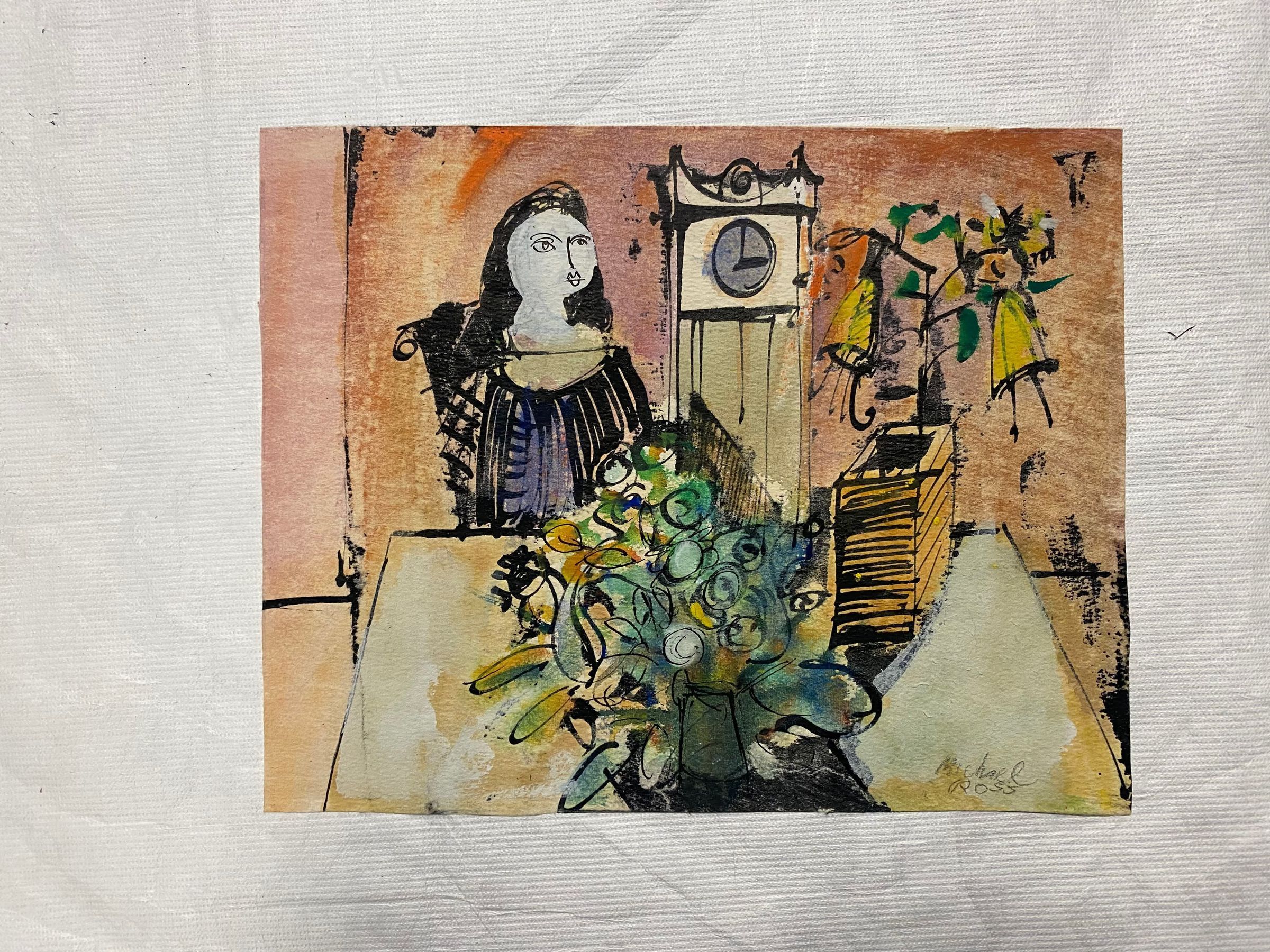 Small horizontal mix media print of a female figure seated in a room. There is a large vase of flowers and a clock on the table in front of the figure in the foreground. In the background, a large clock is to the figure's left. The figure and objects are made of alternating thick and thin inked lines with various types of colors added.