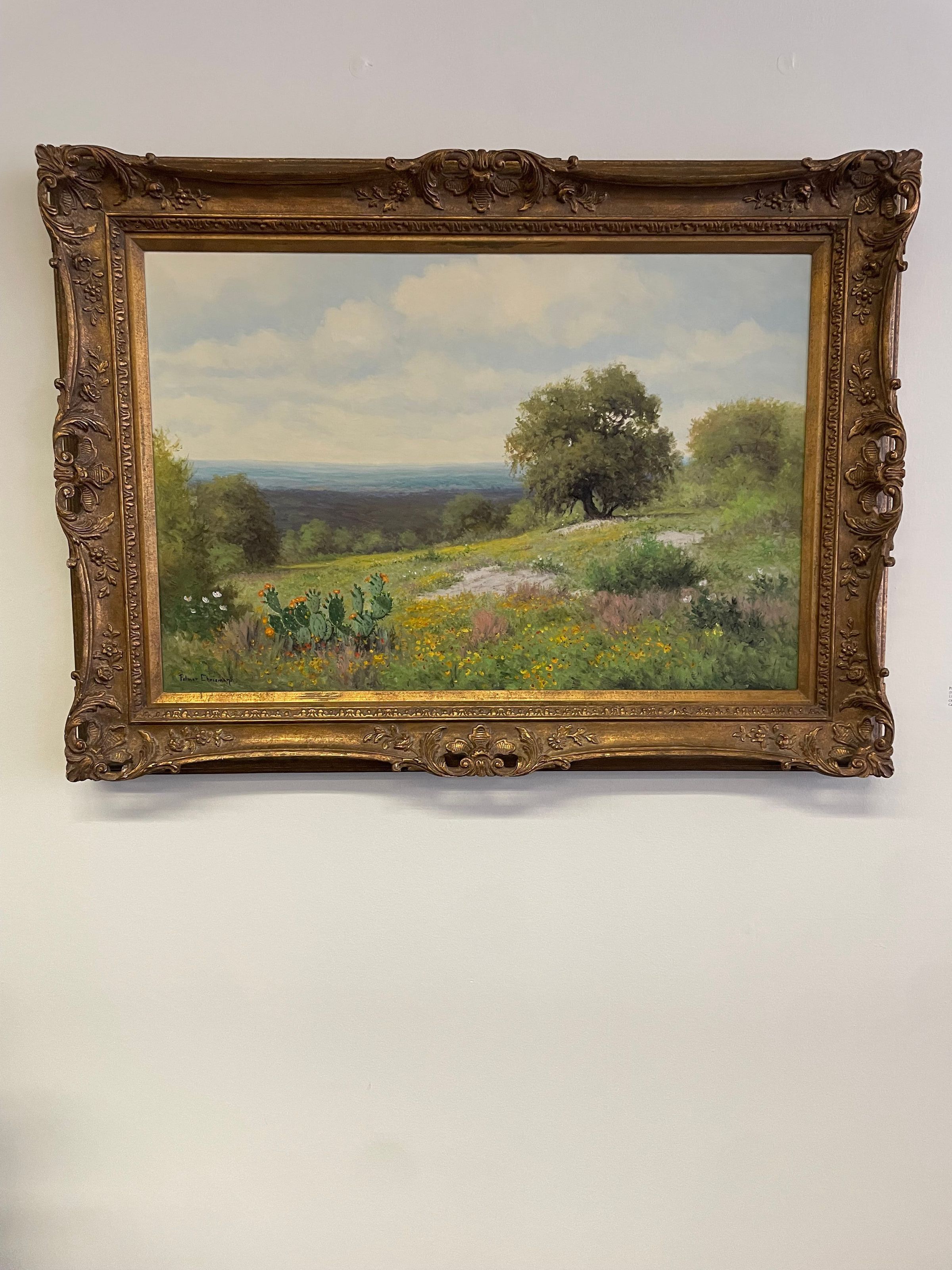 A large horizontal-rectangle oriented work that is framed and is oil on canvas. The work depicts multiple examples of flora in a landscape setting.Collection