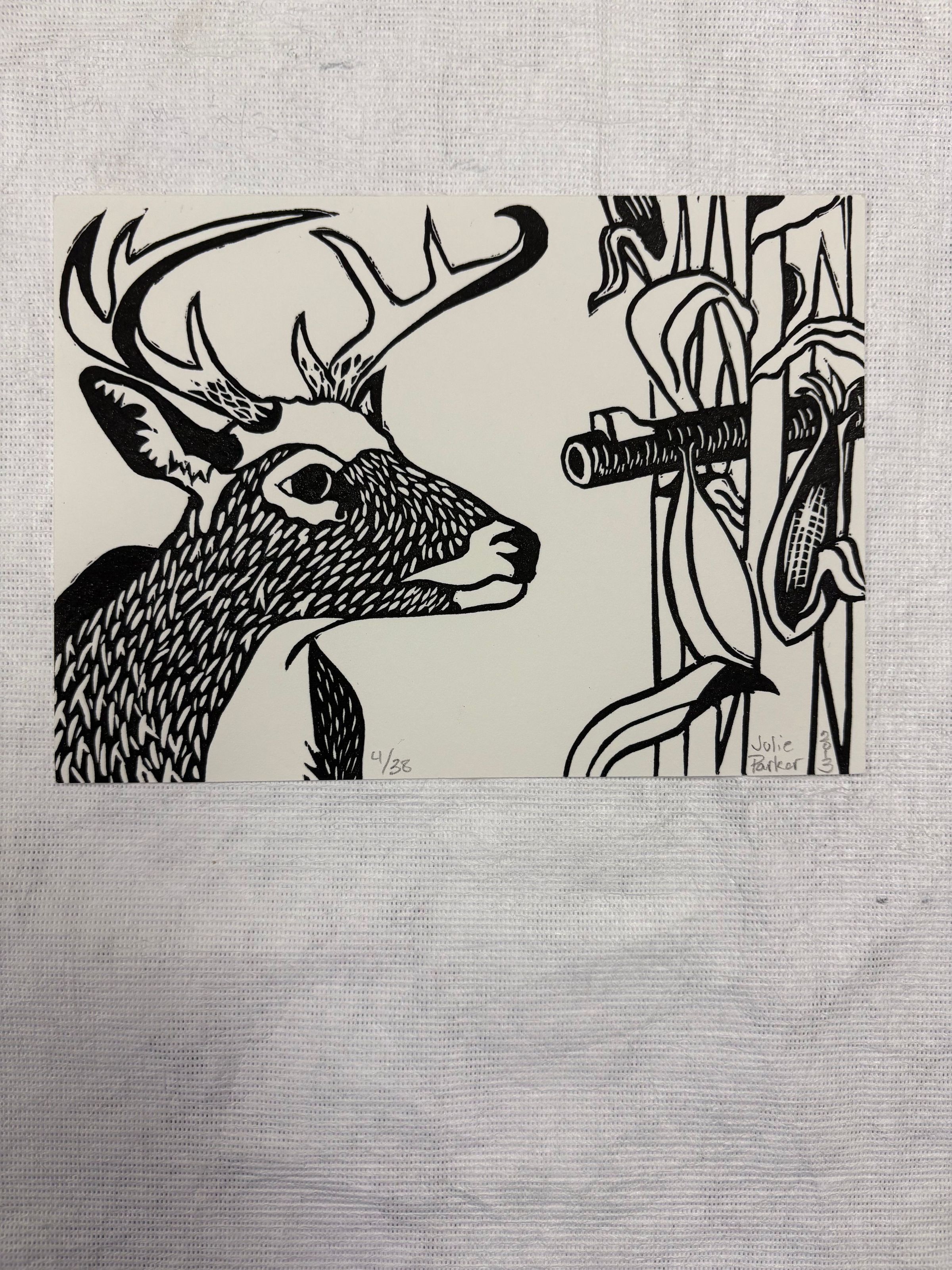 A small, horizontally oriented print that is done on a white ground with black pigment. The print depicts a deer as it looks towards the proper right side of the picture plane as a gun emerges from the tall grass/corn crops that grow next to the deer.Collection