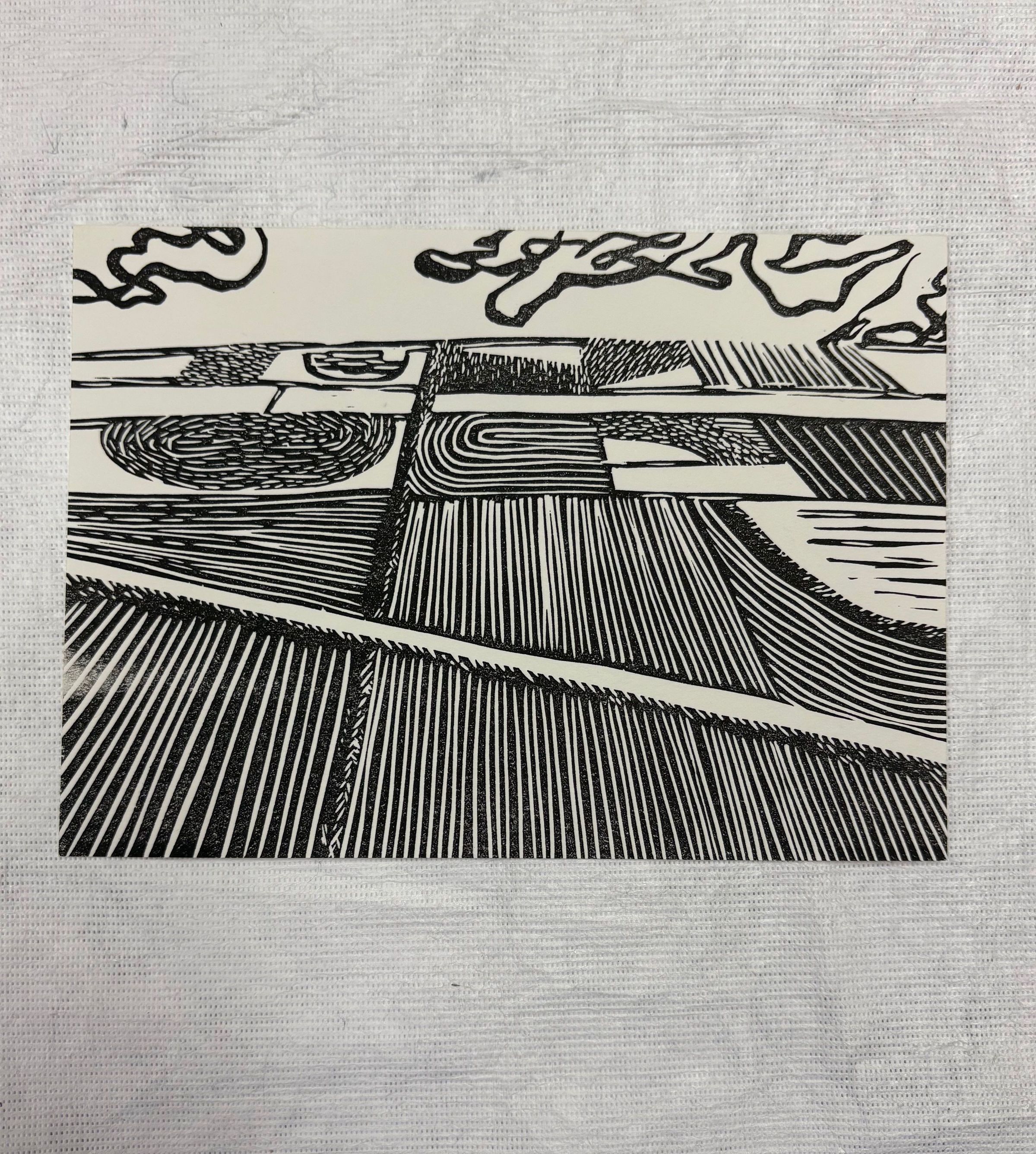 A small, horizontally oriented print that is done on a white ground with black pigment, The print depicts no figural imagery, rather it focuses on a birds eye view of multiple plots of land that have different linear designs and patterns.Collection