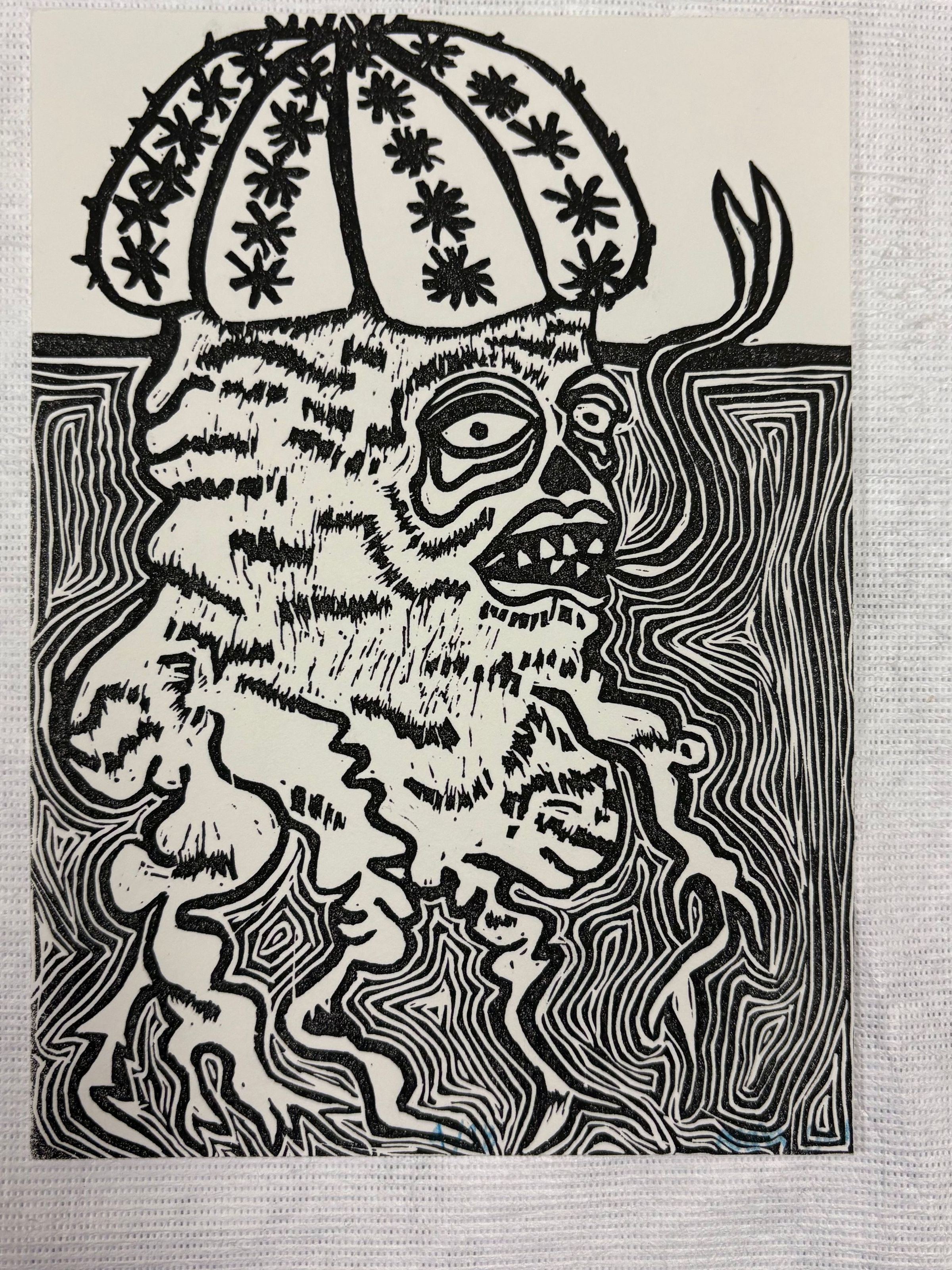 A small, vertically oriented print that is done on a white colored ground with black pigment. The majority of the print is taken up by a jellyfish like figure with sunken eyes and a human like mouth. The bottom 3/4ths of the figure is surrounded by energetic and erratic lines .Collection