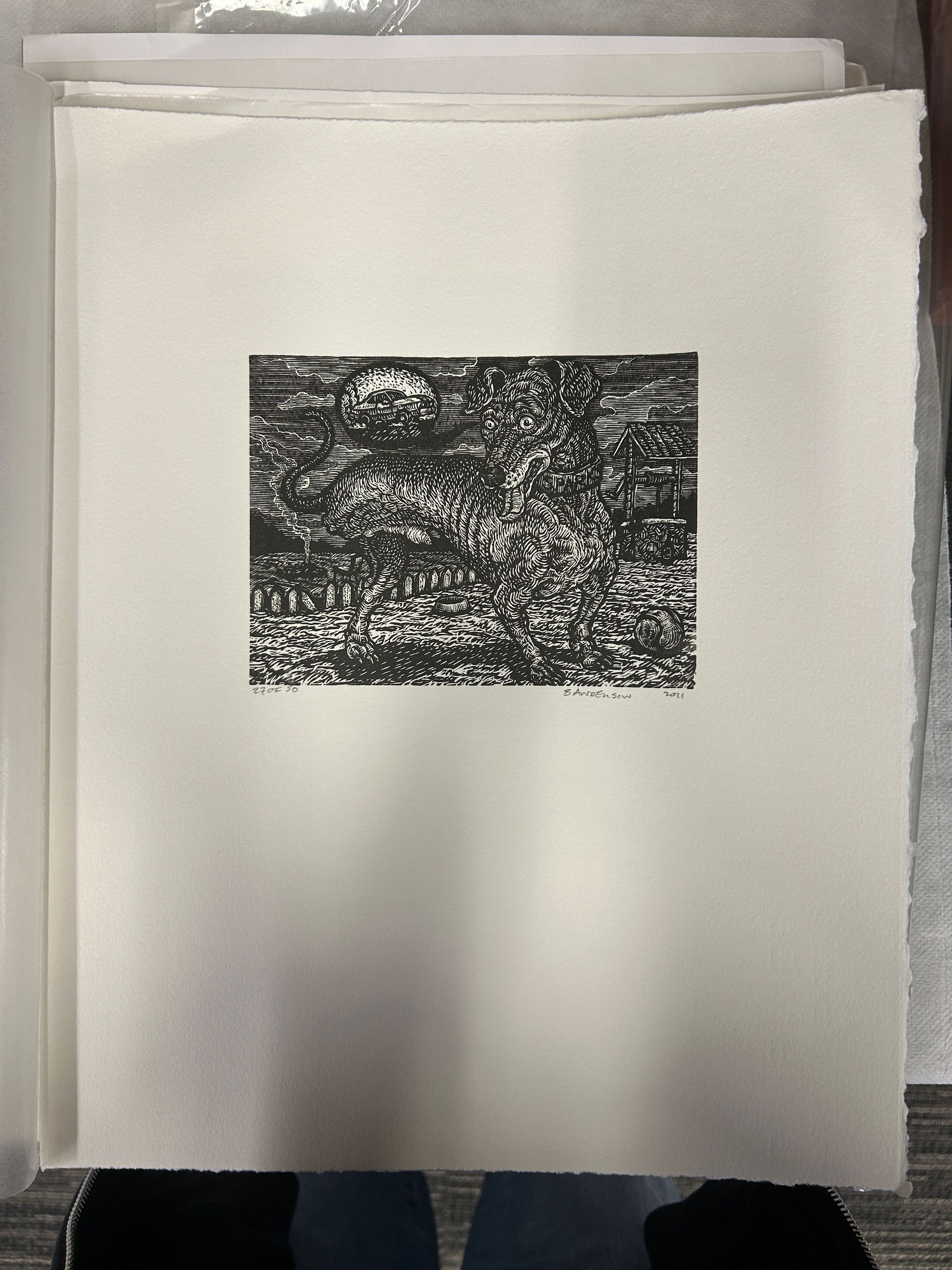 A large black and white print of a three-legged dogCollection