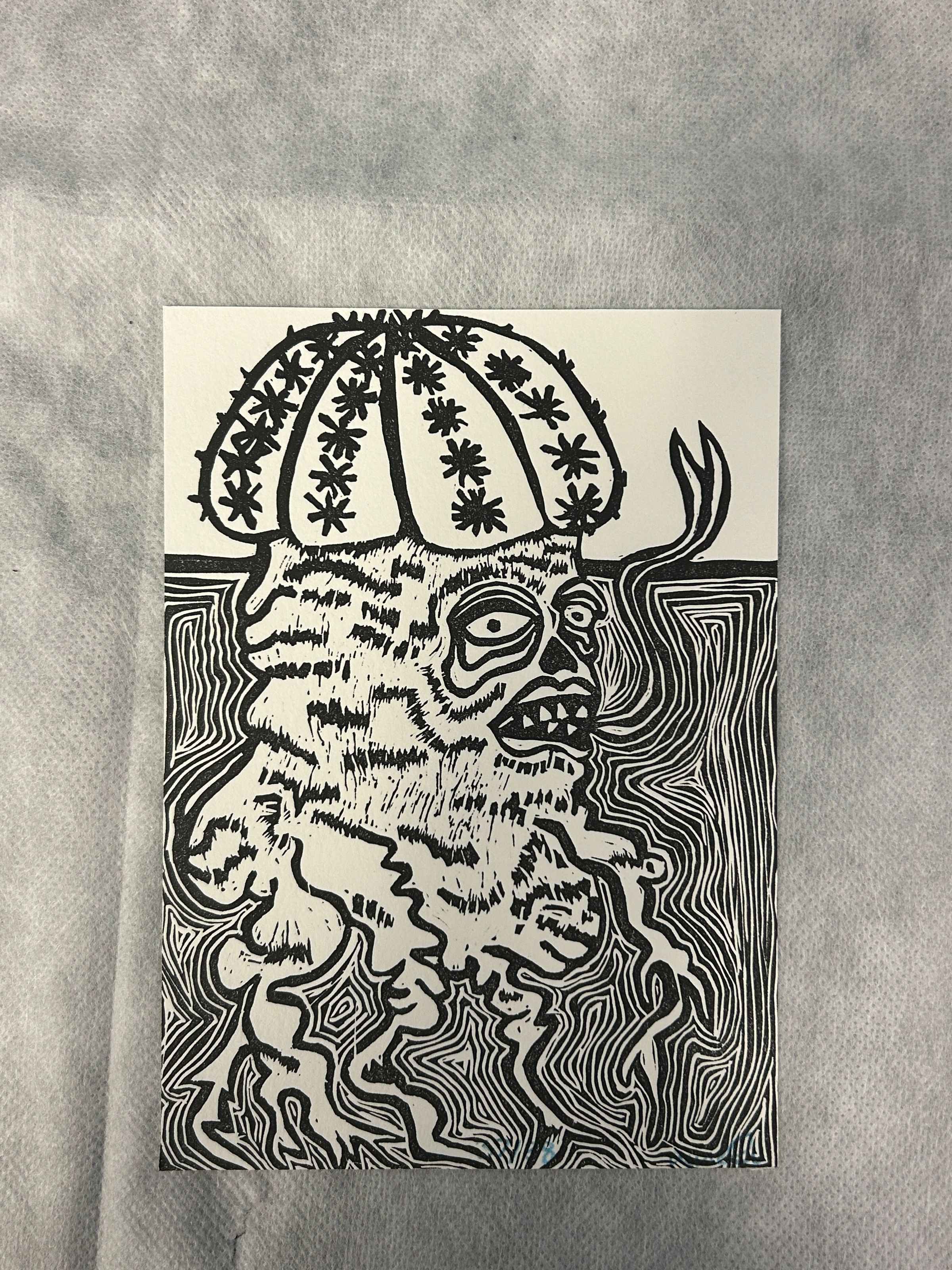 A small black and white print of a zombie-like figure coming out of the ground with a cactus on its head.Collection