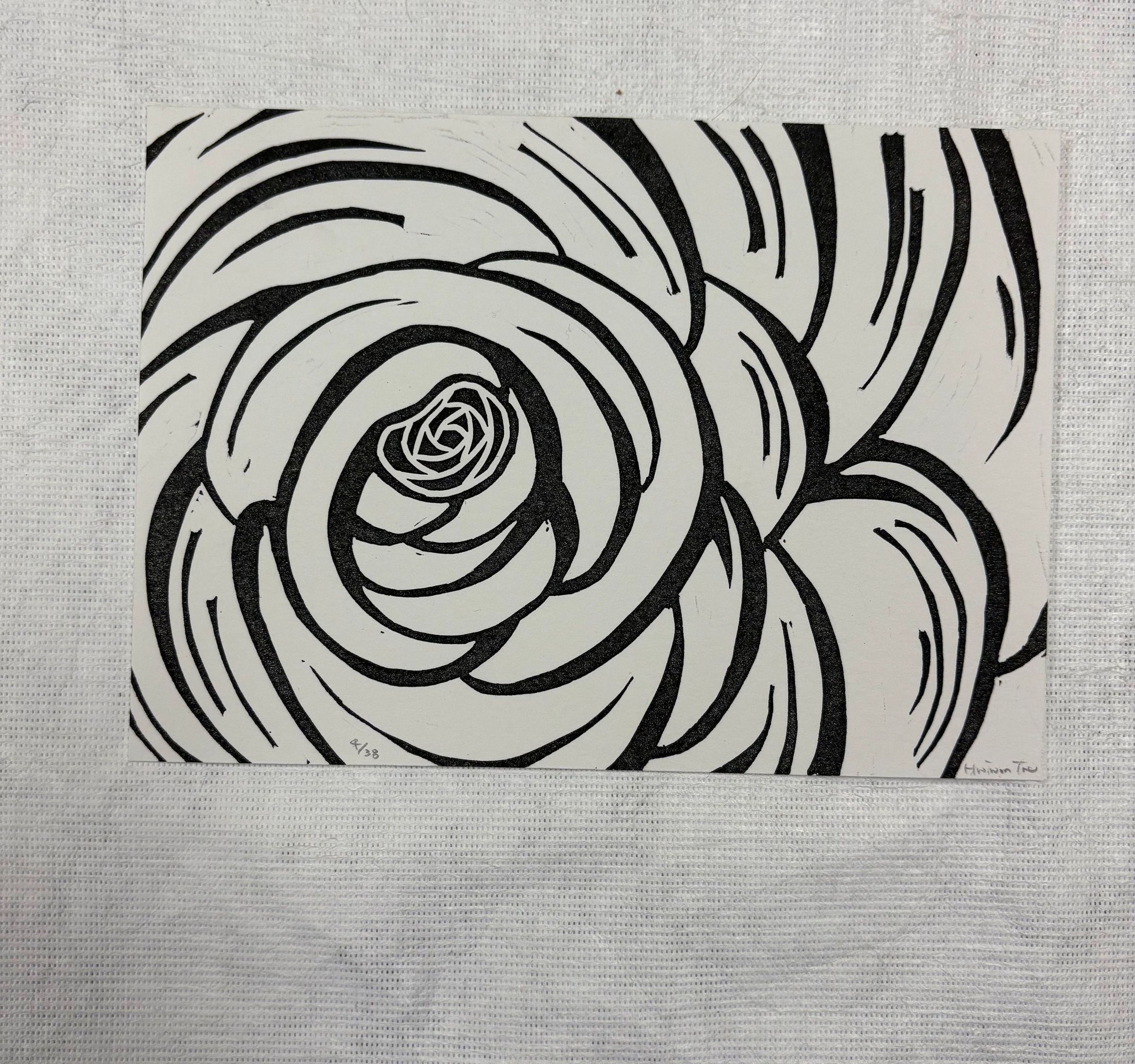 A small, horizontally oriented print that is done on a white ground with black pigment. The print is an up close view of some sort of floral similar to a rose. It is constructed with geometric shapes and thick curving lines that overlap with one another.Collection