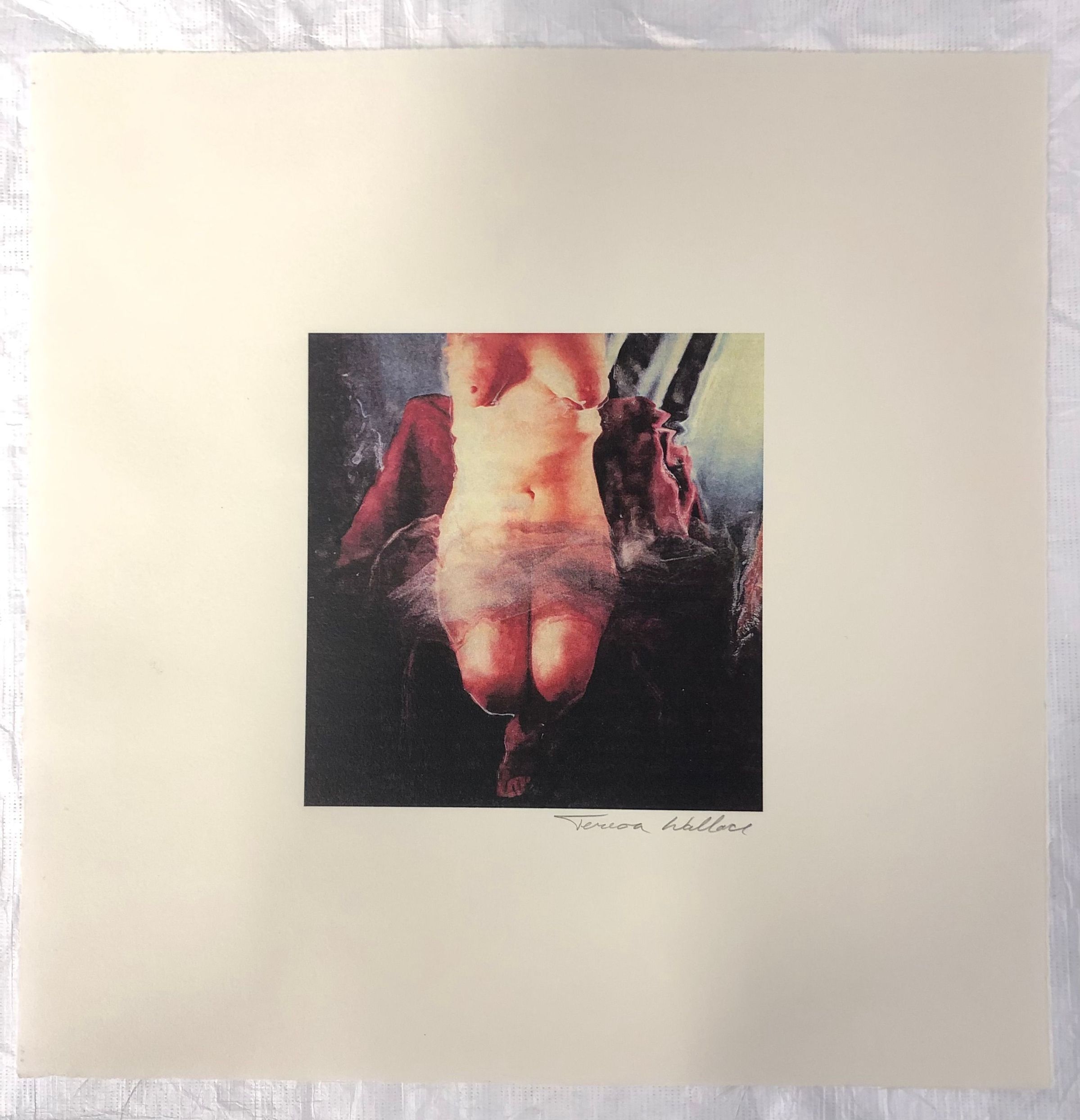 Small photograph with a wide white border depicting a feminine nude figure from the bust down, seated on a red seat with a tulle fabric on the lap. There is a slight ripple effect at the top, and the background is in shades of gradient blue.Collection