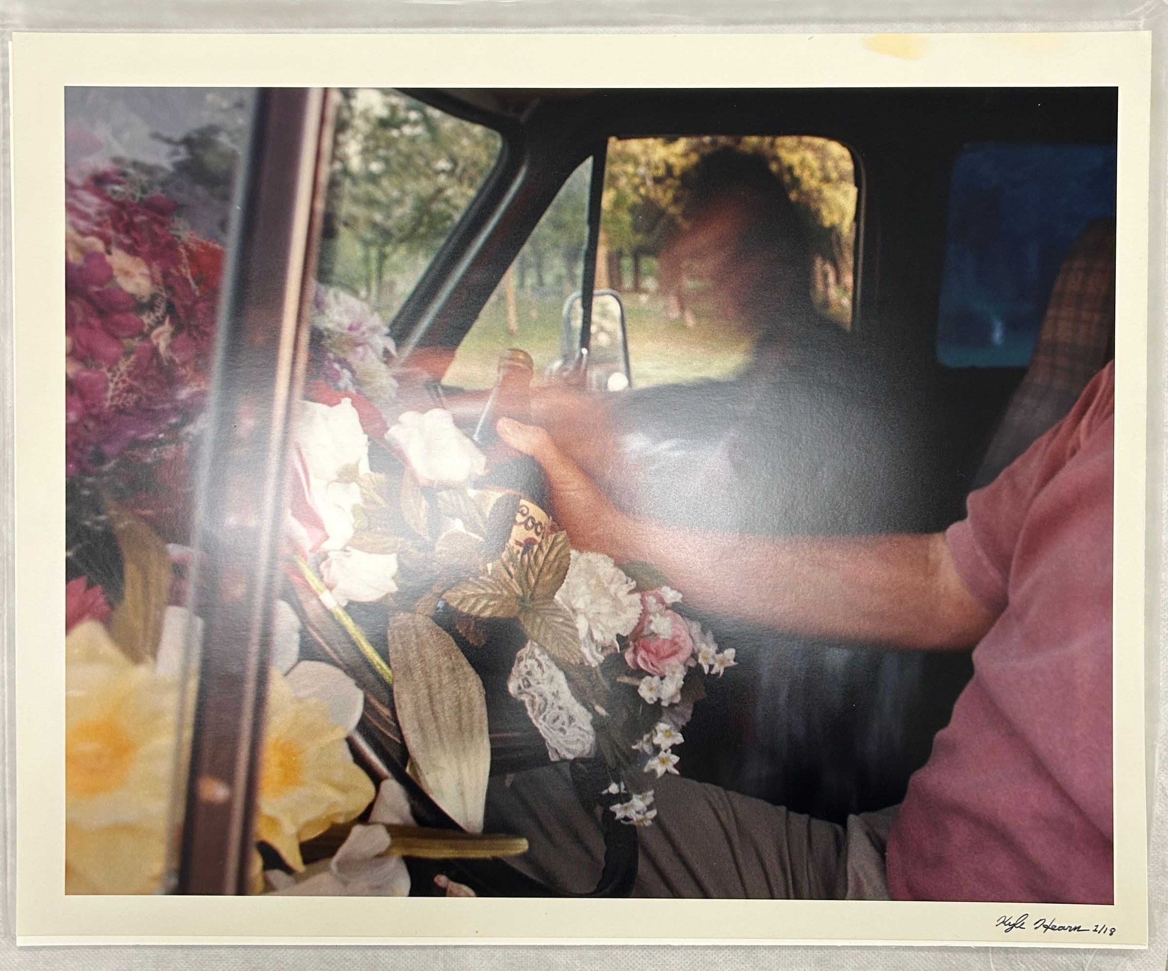 A large photograph of two people in a car with flowers in front of them on the dashboard. One figure is holding a bottle of beer.Collection