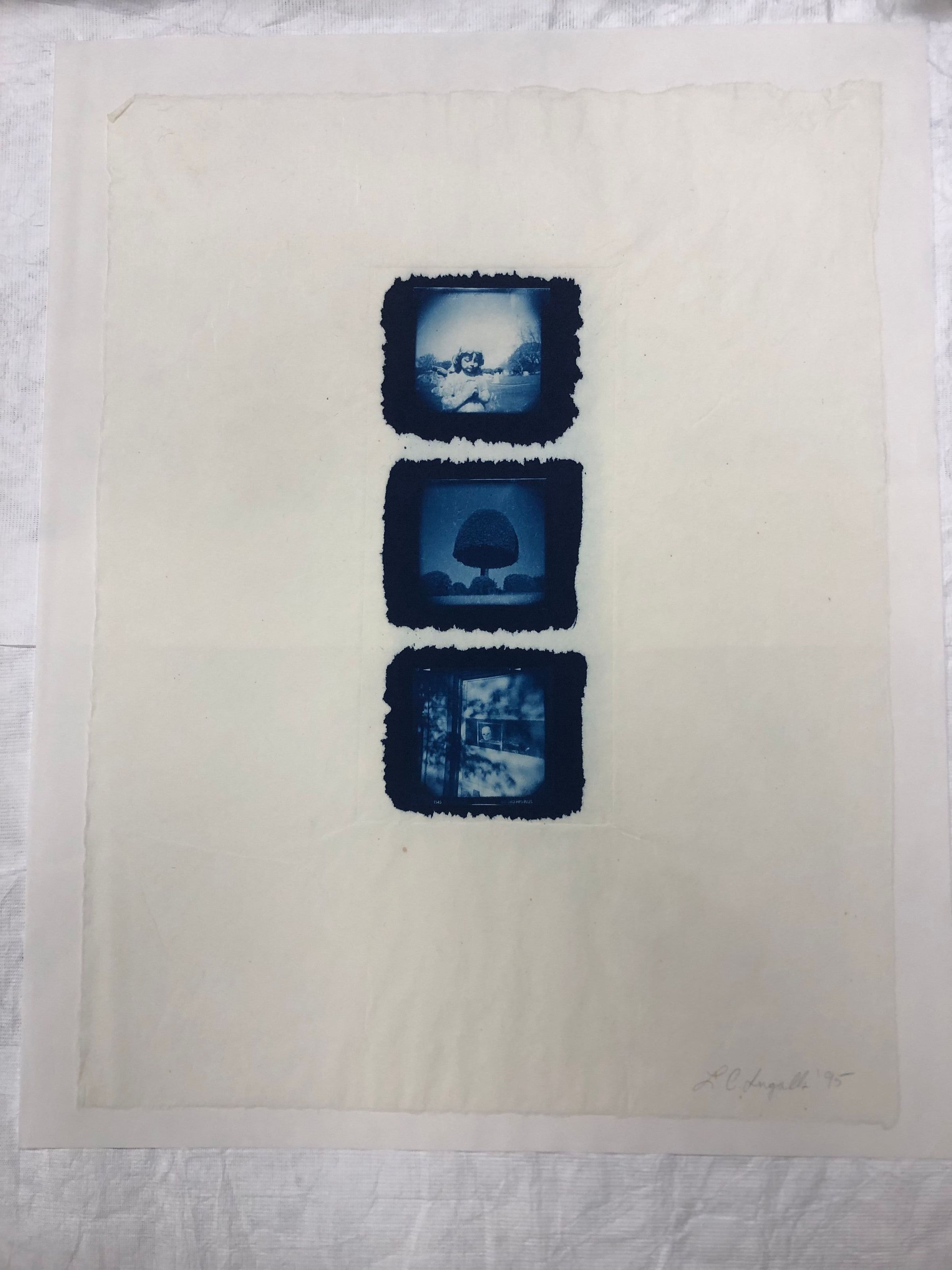 A medium sized print of three small vertical photos in blue ink. The top image features an angel statue in a graveyard, the middle depicting a mushroom shaped tree above the tree line, and the bottom depicting the side of a house, with a mask seen pressed against the window.Collection