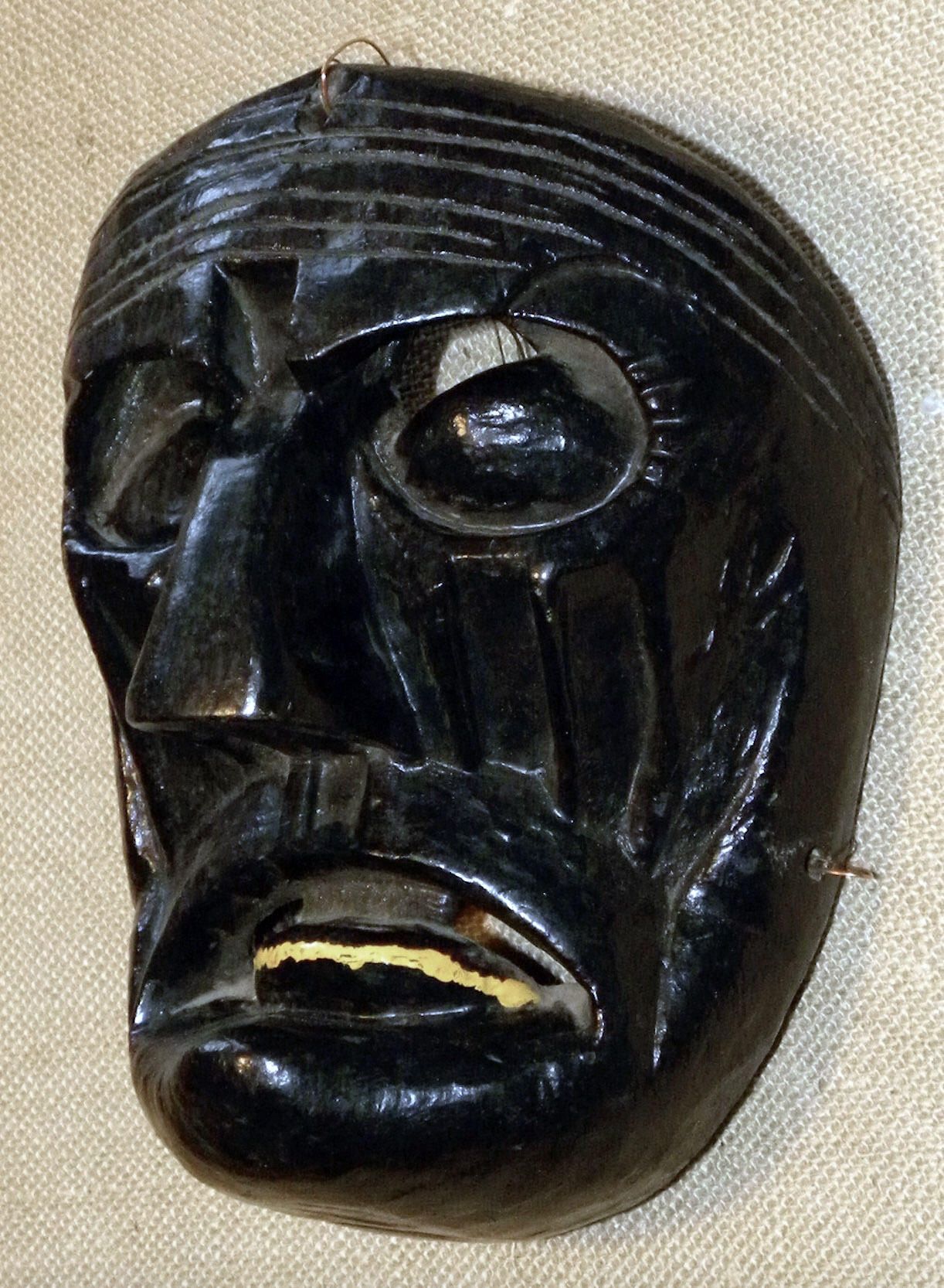 A life-sized oval wood mask depicting a black figure with incised lines on the forehead and around the eyes and mouth. Sunken eyes with cutout eyeholes above. A large triangular nose is above an open mouth with a yellow highlighted tongue. A wire is attached to the back of the mask.Context
