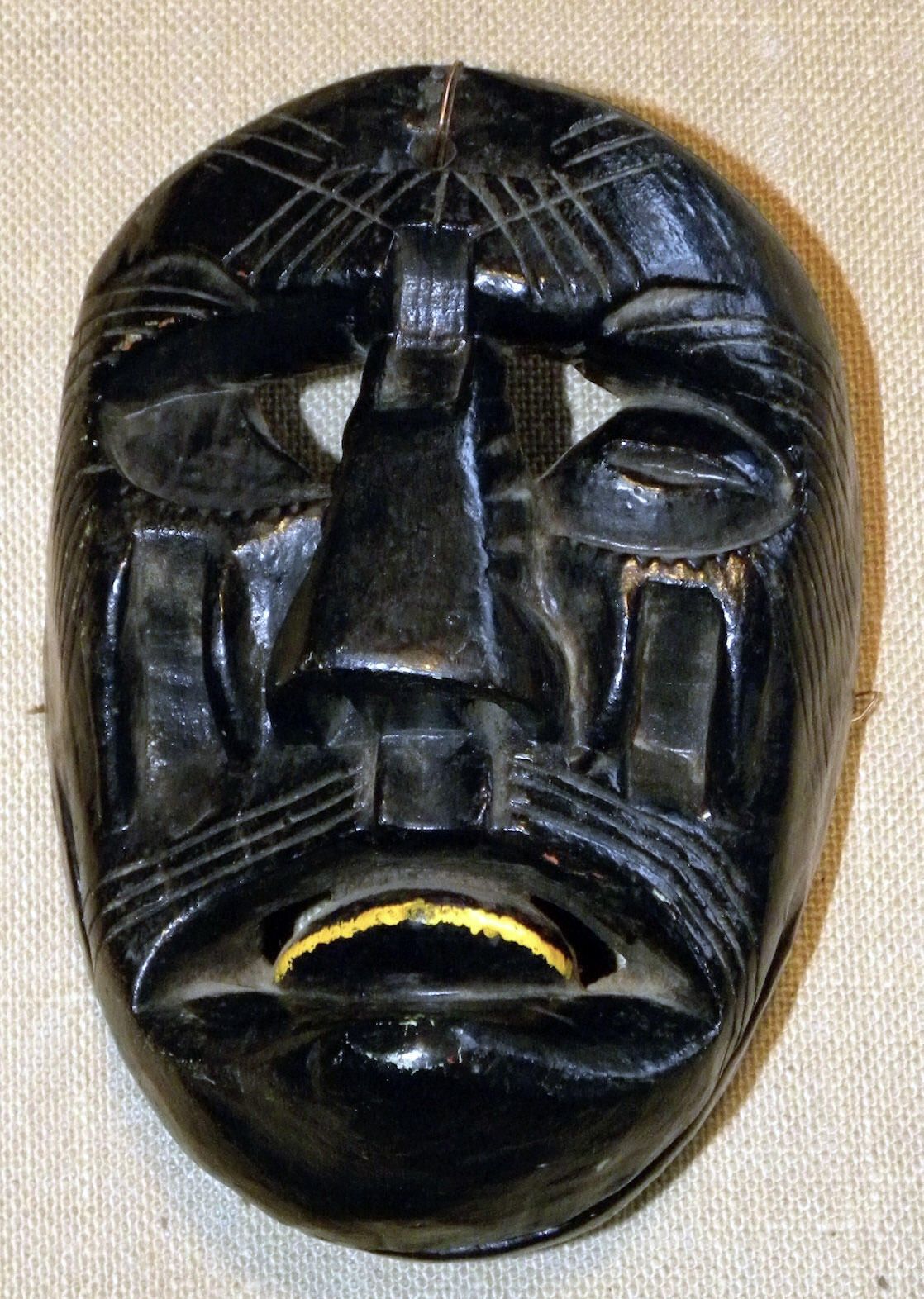 A life-sized oval wood mask depicting a black figure with incised lines on the forehead, around the eyes, and above the mouth. Sunken eyes with cutout eyeholes above. A large triangular nose is above a closed mouth with a yellow highlighted tongue. A wire is attached to the back of the mask.Context