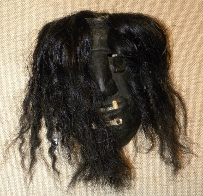 A large rectangular wood mask depicting a coal-black figure. Long black animal hair attached to the head and the chin. The cutout eyeholes are under the forehead. A large nose is above the cutout mouth with two tusks. A wire is attached to the back of the mask. Overall good condition.Context