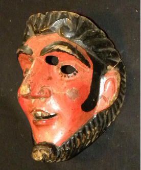 A life-sized oval wood mask depicting a man with a blush red complexion and red blush accents on cheeks and sharp nose. Black eyebrows are over two sets of cutout eyeholes, one with black lashes underneath. The nose is above an open mouth with teeth. There is carved black hair leading into a carved beard. Painted black sideburns. A wire is attached to the back of the mask. Various signs of paint chipping.Context