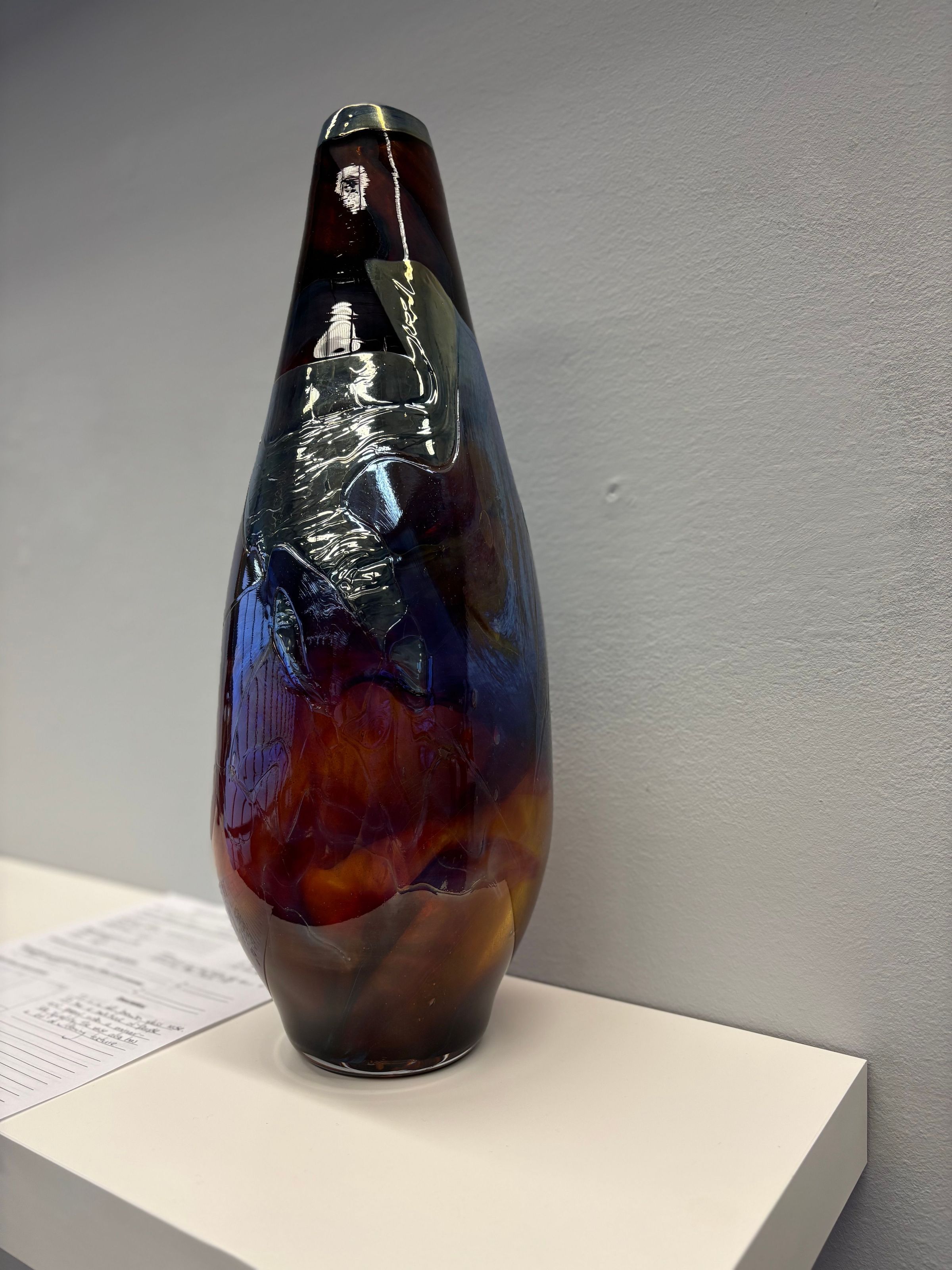 Large multi-colored vase with mirroring. It is in a teardrop shape with texture around it.Collection