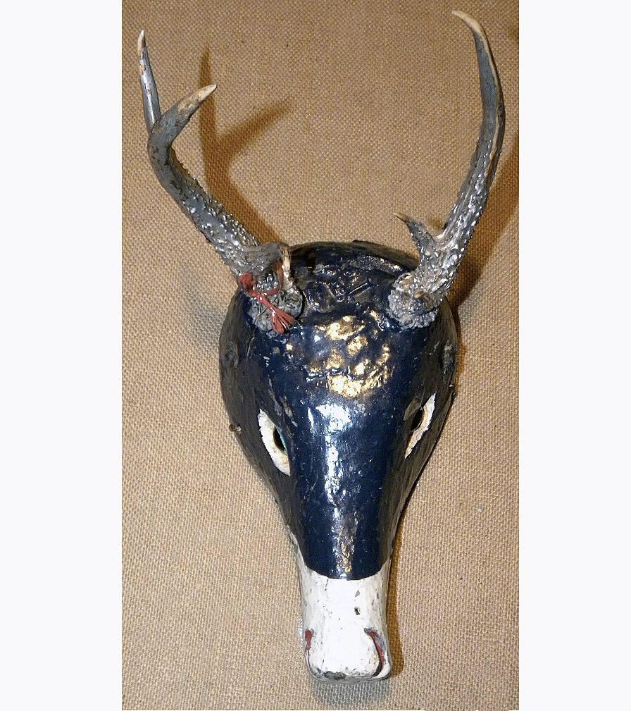 A long teardrop-shaped wood mask depicting a dark Aegean-blue deer. Silver deer antlers are attached to the top of the head. Carved and painted black eyes are outlined with white and teal. A long white muzzle has red accented nostrils and an open mouth. A wire is attached to the back of the mask. Signs of paint loss and very rough texture.Context