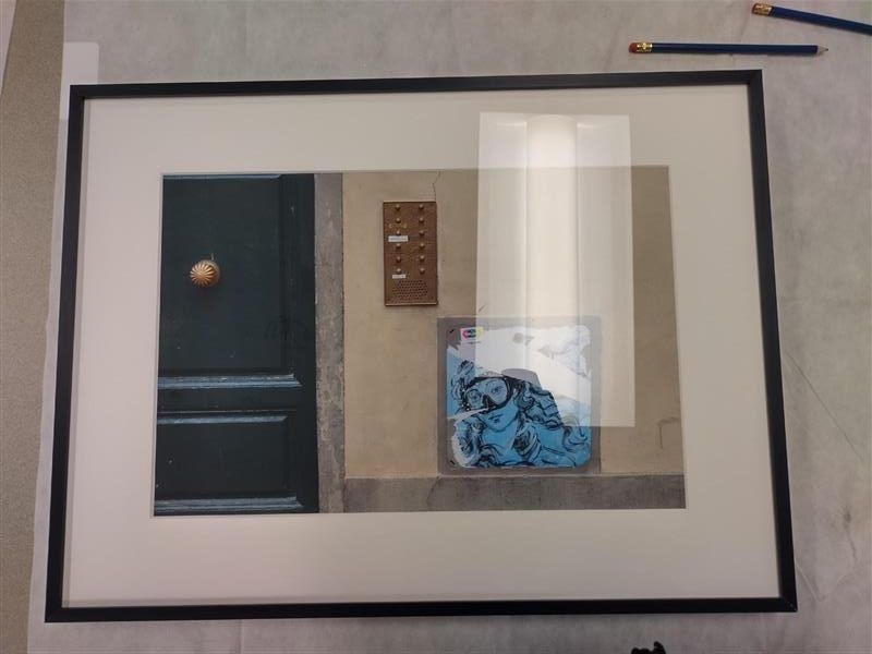 The image depicts a green door on the right with metal doorbells in the center and a blue painting of a diver in the bottom center.Collection