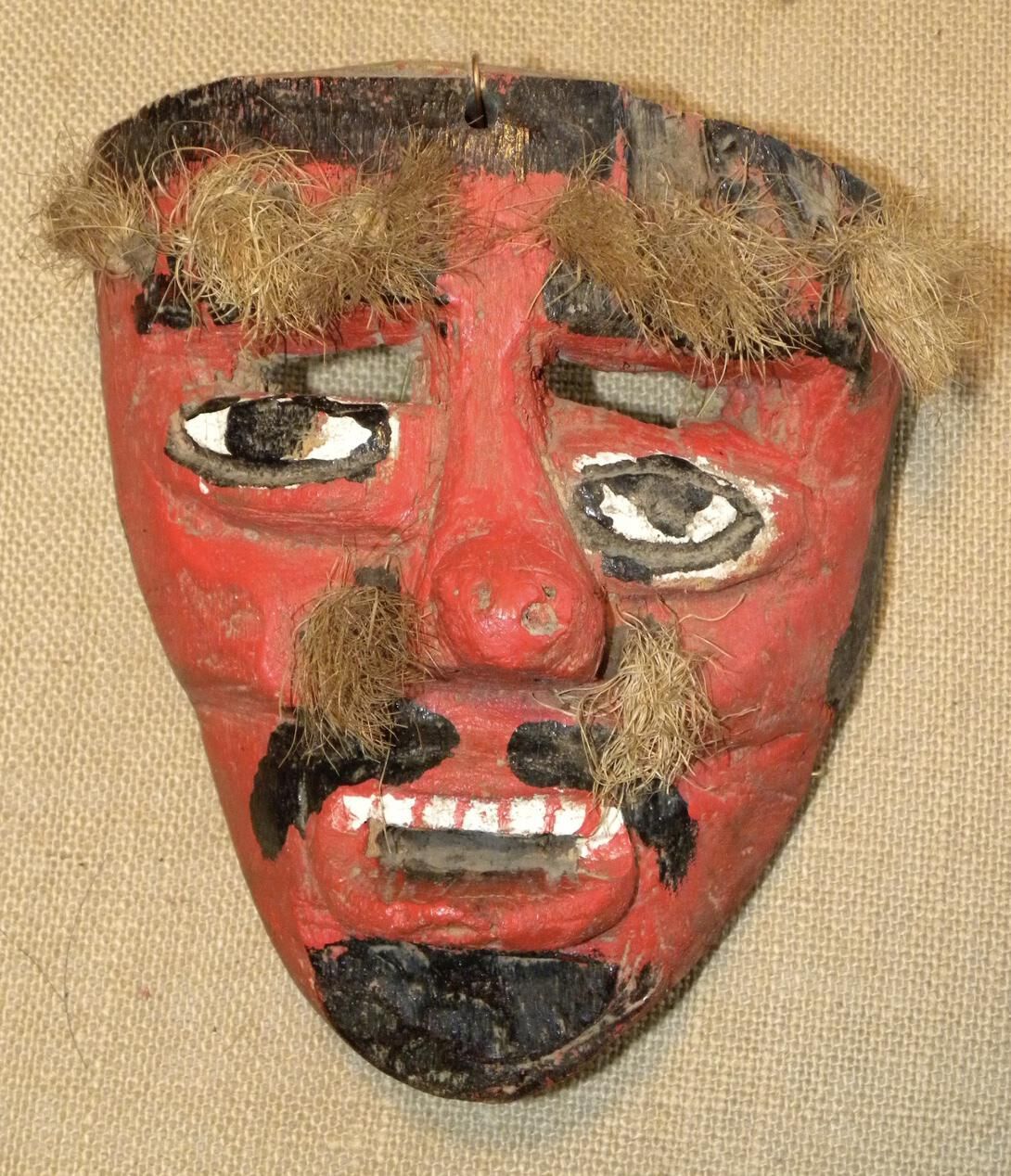 A life-sized triangular wood mask depicting a man with a red face. The hair, parted mustache, and goatee are painted black. Tufts of fiber are attached to the eyebrows and mustache. Cutout eyeholes for the wearer are above lopsided painted black eyes. A sloping nose extends over a cutout mouth with painted white teeth. A wire is attached to the back. Some signs of pigment loss.Context