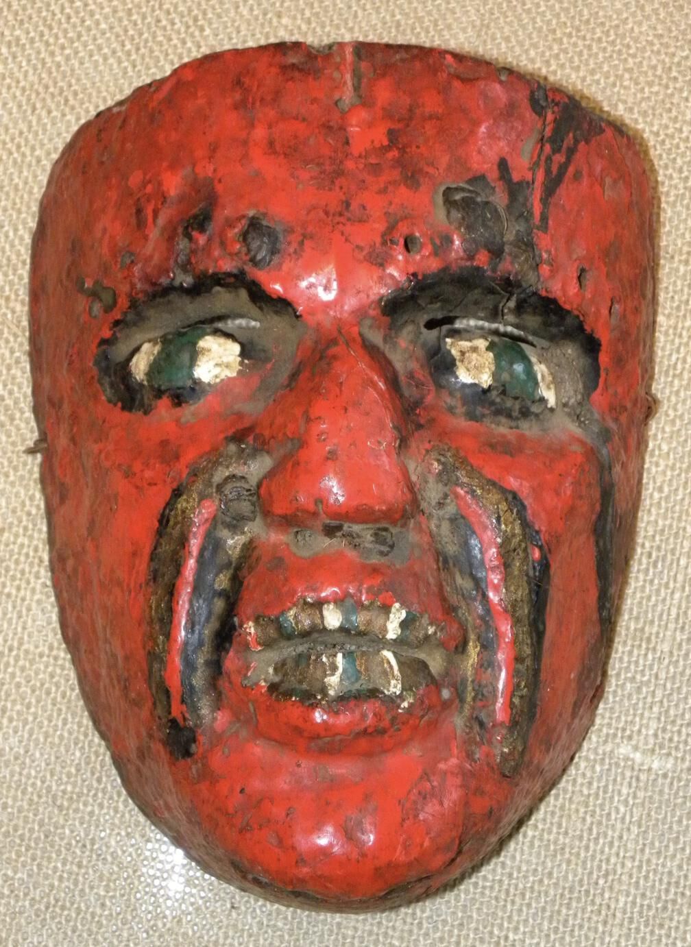 A life-sized oval wood mask depicting a man with a red face. Small cutout eyeholes for the wearer are above green eyes outlined with black. A small red nose is above an open mouth with white, green, and black teeth. There are incised wrinkles around the mouth. A wire is attached to the back of the mask. Overall muddled texture and pigment loss.Context