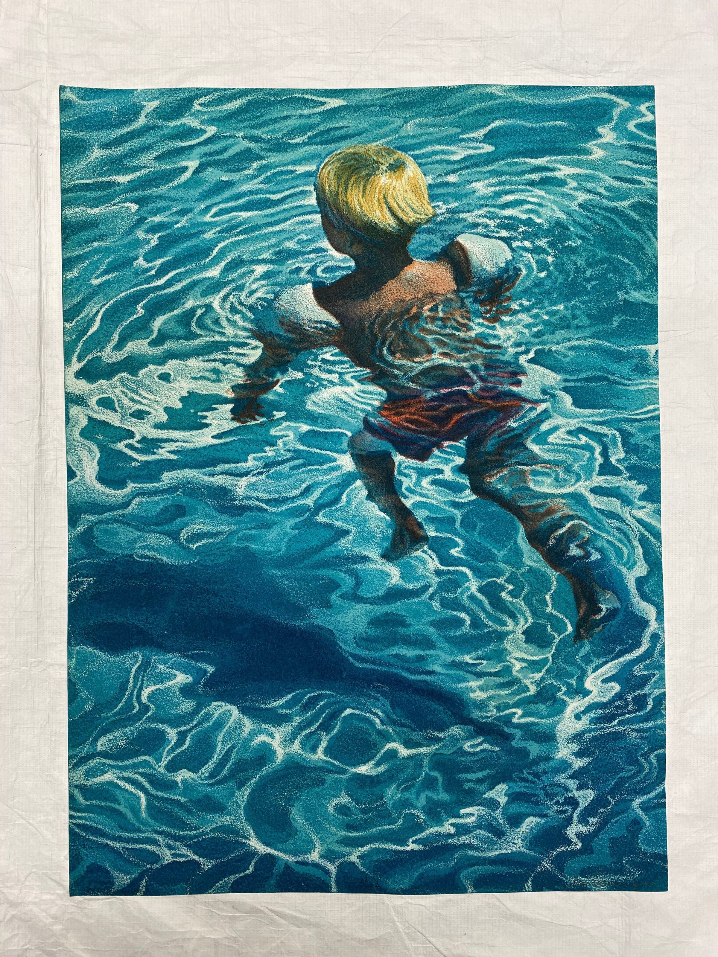 Medium-sized mezzotint print vertically oriented of a child in motion swimming through a pool of water. The water appears transparent as light reflects off the breaking water rippling and swirling as the figure moves, and the figure's shadow is depicted beneath the surface.