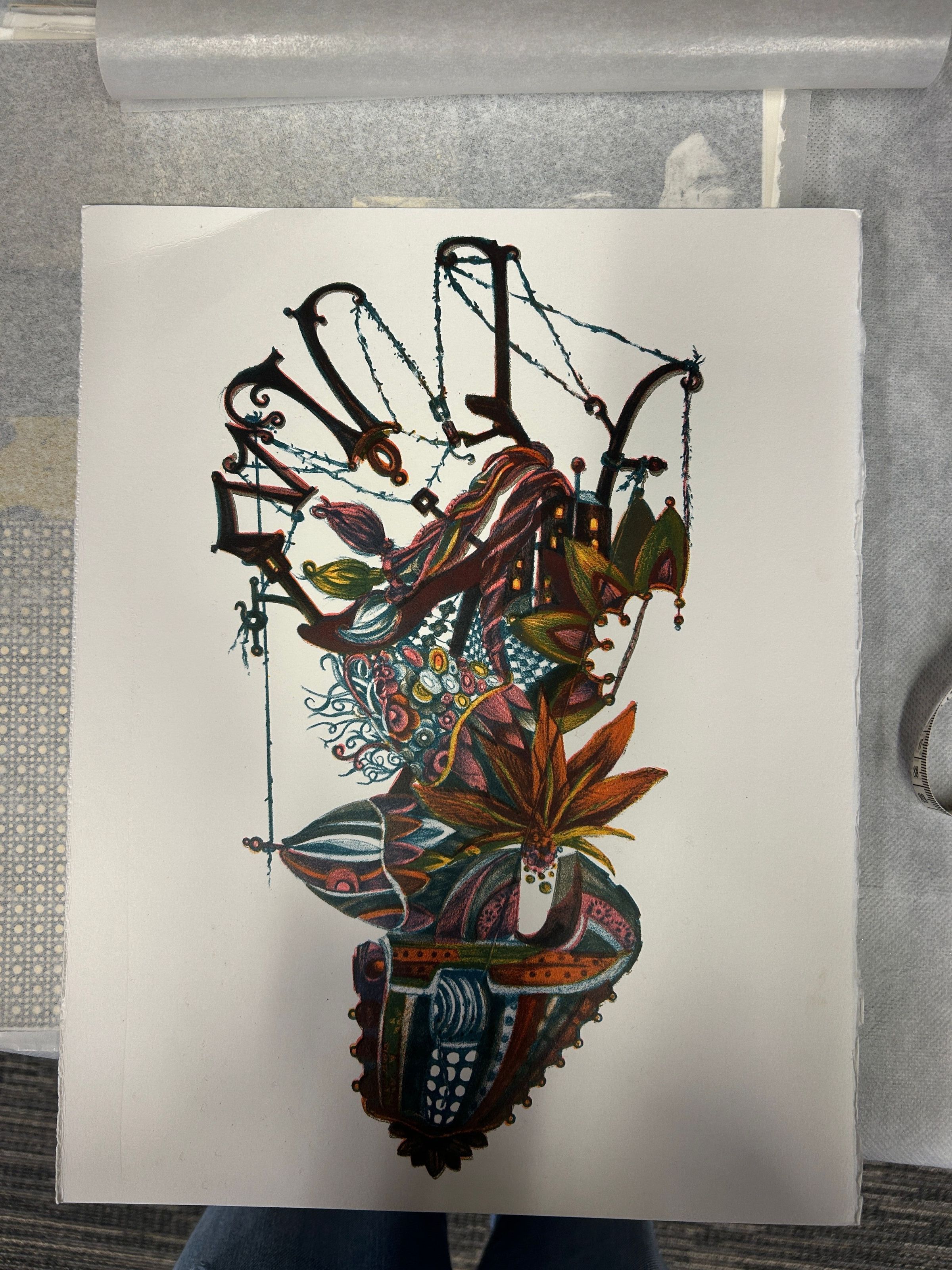 a large, colorful print of a mechanic subject made of various shapes, lines, and texturesCollection