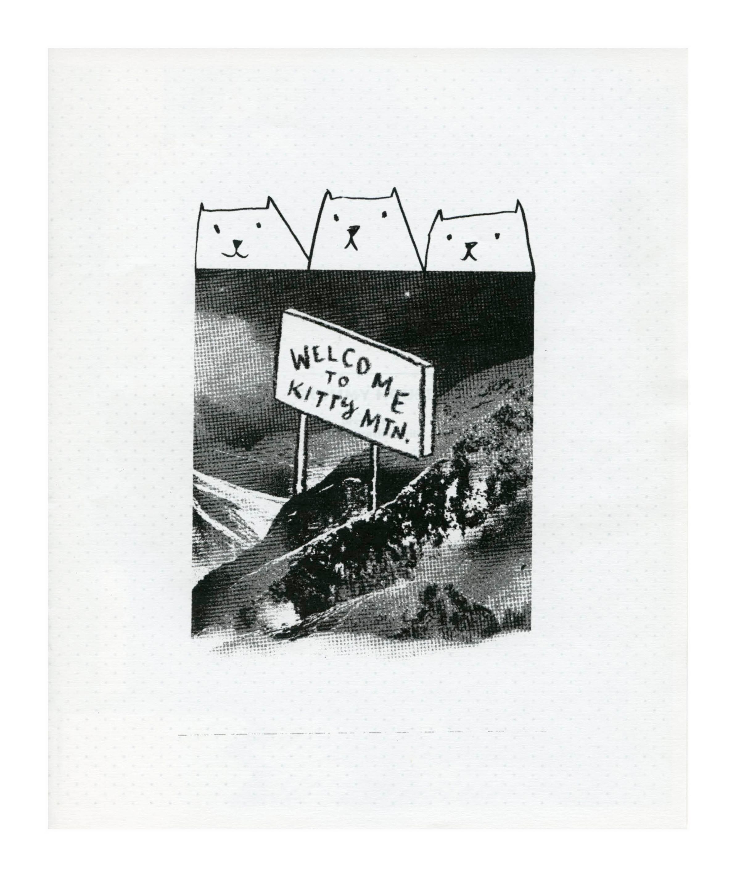 Black and white printed booklet showing a photographed mountain with a sketched sign on it, and 3 kitten heads along the top edge of the image.Collection