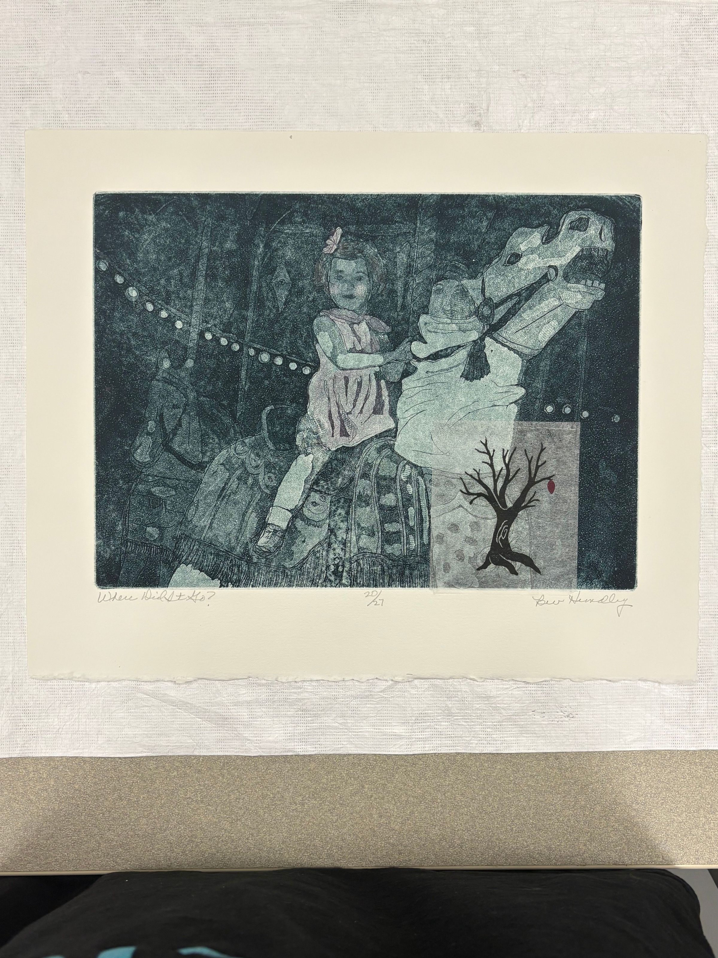A medium sized, horizontally oriented print that is done on a cream colored ground with pink, blue, white and black ink. At the center of the print there is a young girl that rides a carousel horse as she looks out to the viewer.Collection