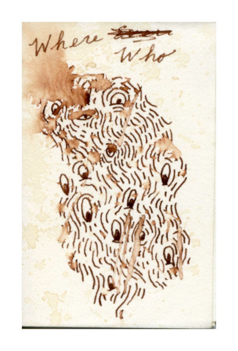 The front cover is white cardstock paper with brown ink drawings. The image on the front depicts what look to be eyes with lines surrounding it. The title is written in cursive.Collection