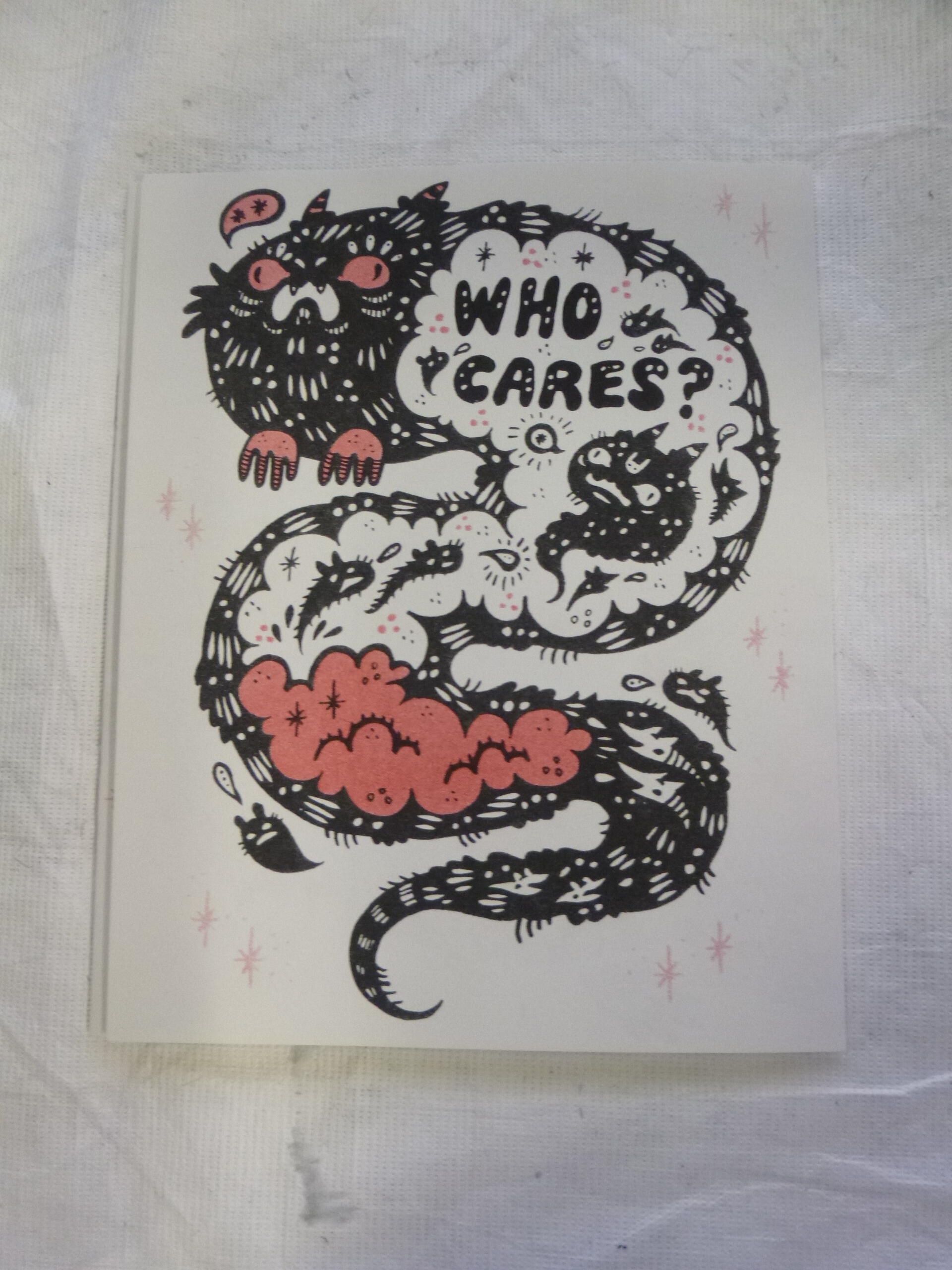 A small, vertically-oriented artist book with seven ghost-like creatures printed in red and black ink.Collection