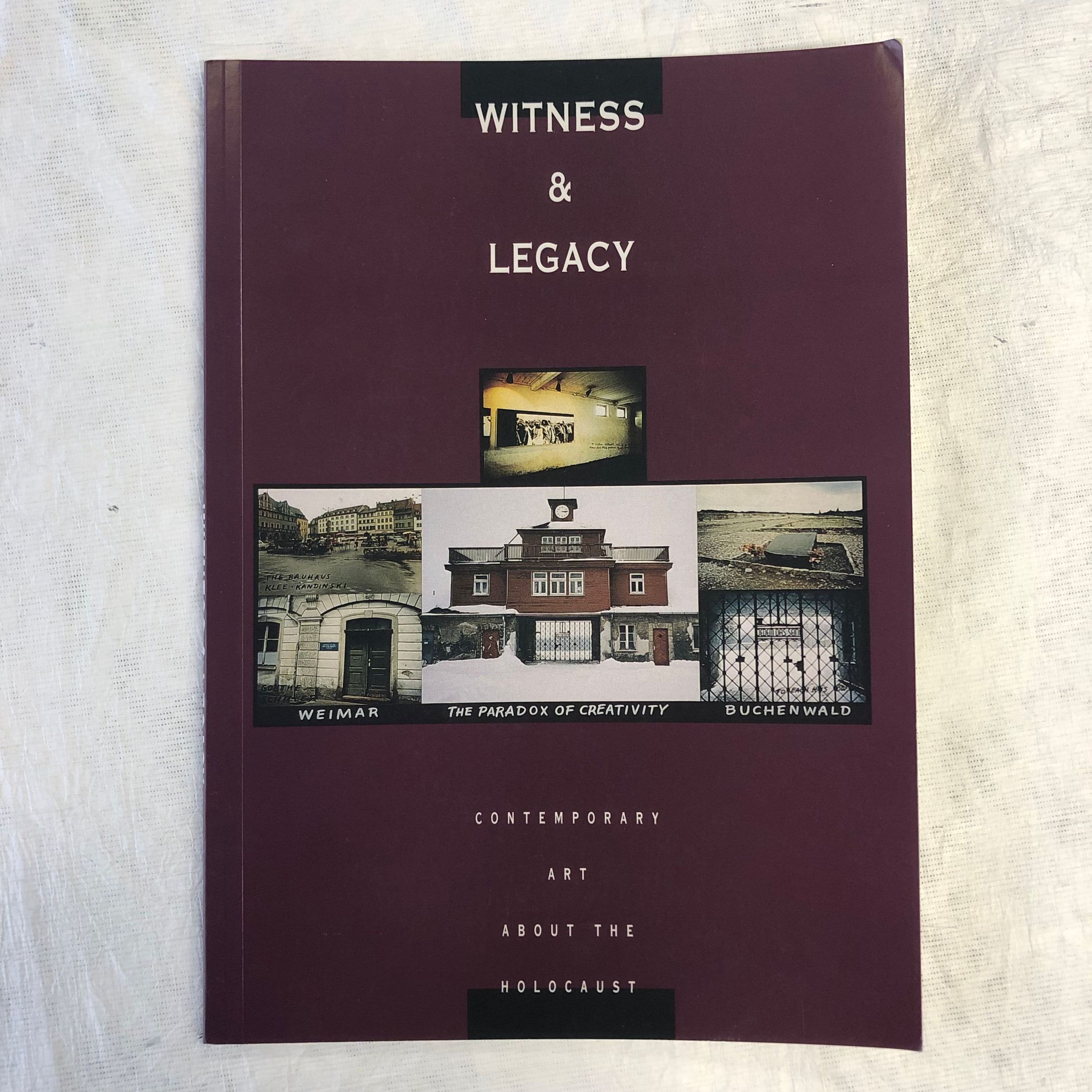 A medium-large, thin, plum colored book with the title in white, central at the top and bottom, the front cover split by a row of photos in the center. The interior contains an exhibition catalogue that introduces the Holocaust and the various ways modern artworks react or look back on it, the images in color.Collection