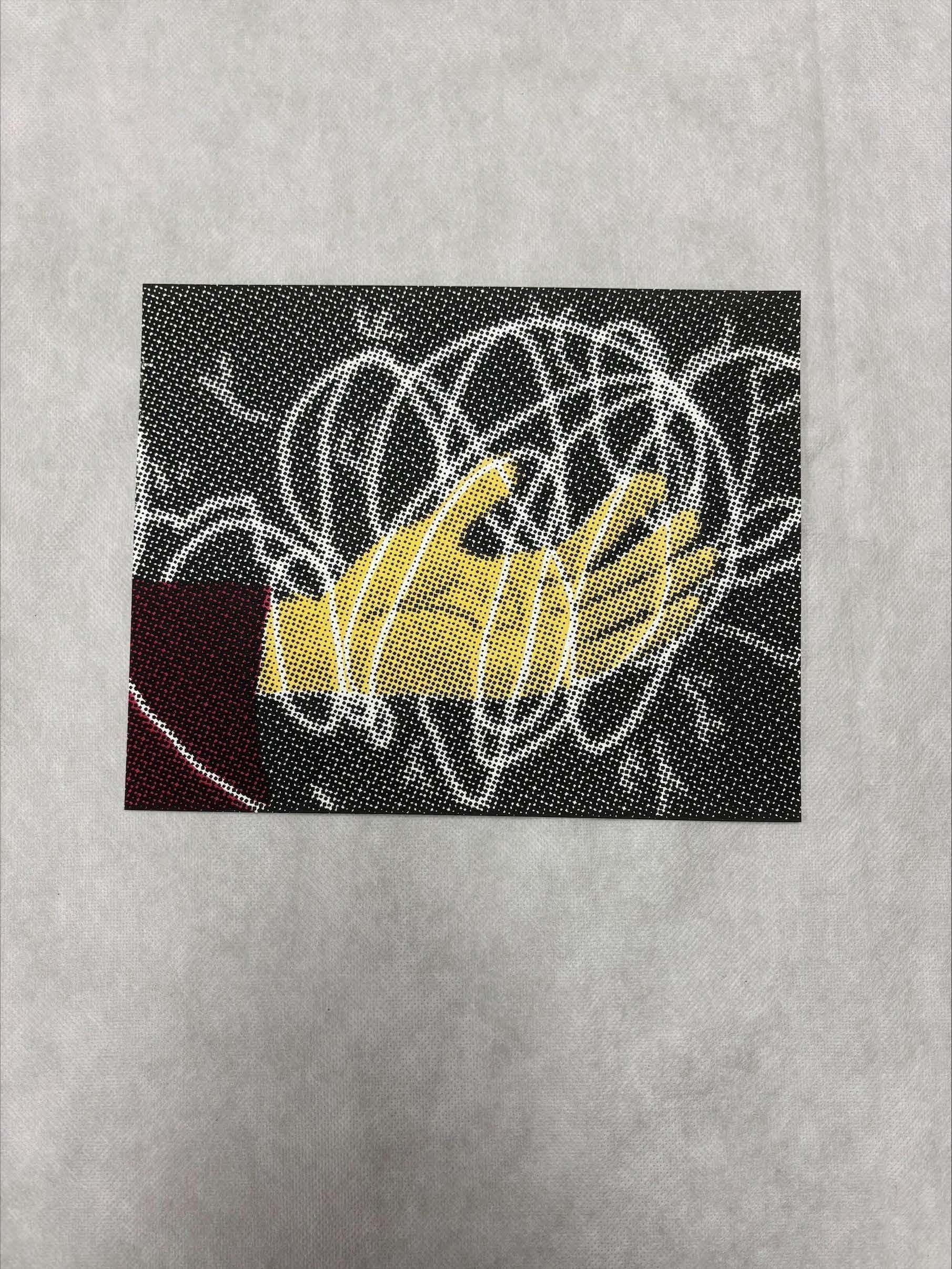 A horizontally oriented, medium sized print that uses color tones of yellow, black, white and red to compose the image. The print has a centralized subject of a yellow hand with sporadic lines curving around and in the vicinity of the hand. overall the print looks to be composed of minute dots and lines that create a rhythmic patterning.