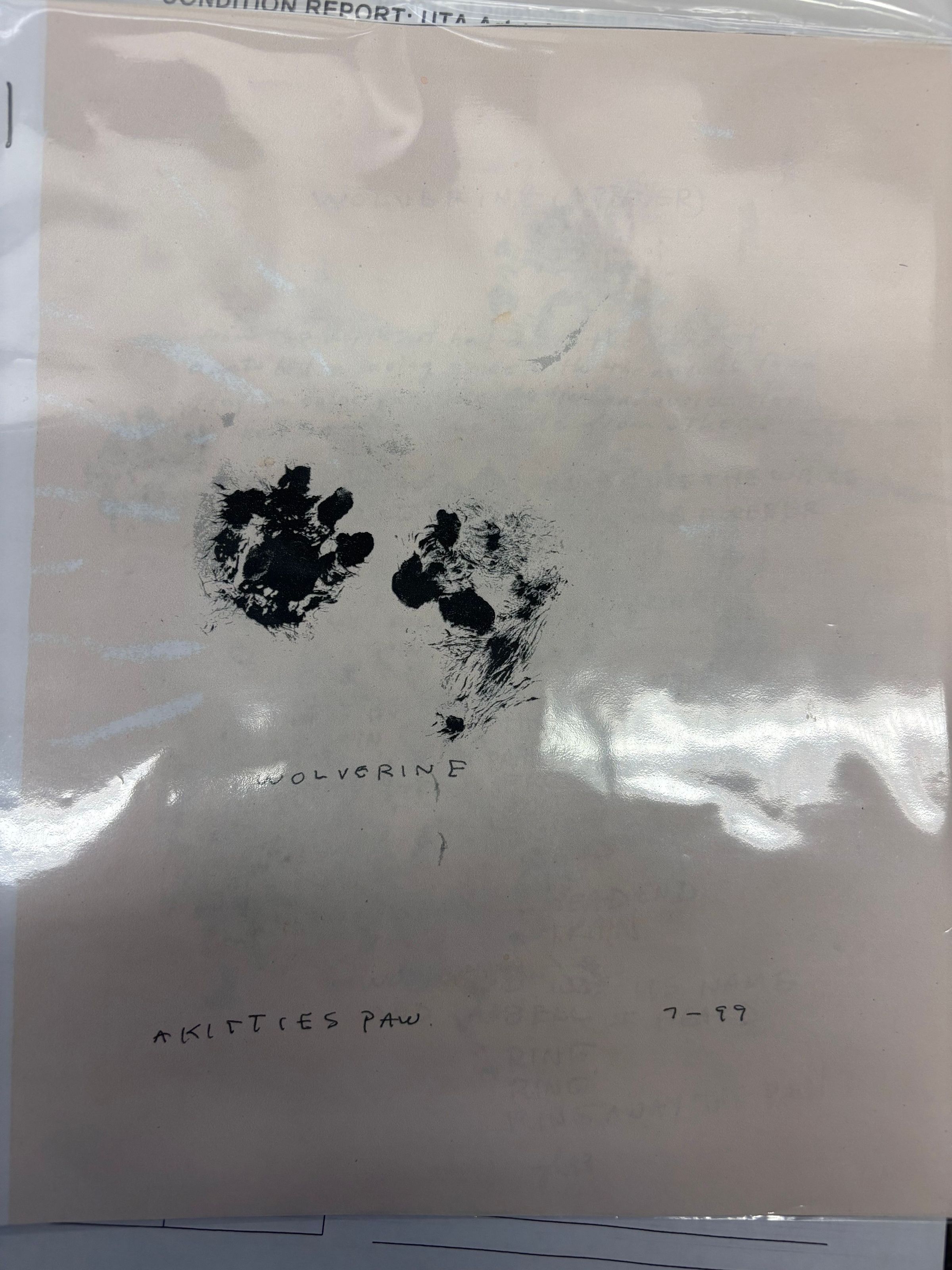 The zine is two pieces of paper stapled together and are a photocopied pink-beige color with a white border at the binding. The cover has paw prints and hand-written text. The interior pages contain similar content as the front cover.Collection