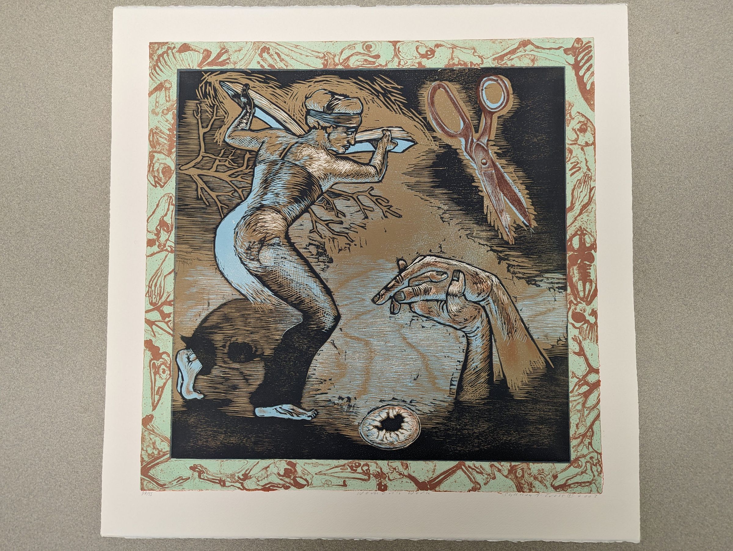 A large square print showing a woman bending over with her hair tied back, holding an object open with arms spread. Clustered alongside her are images of tree branches, a pair of scissors, folded hands, and a hole. The print is bordered with a red and green design of bones.Context