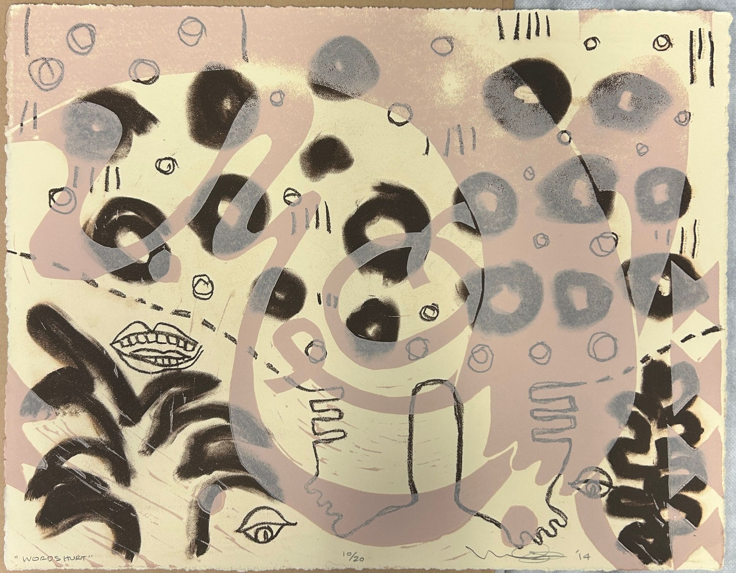 A large print on cotton paper includes pencil drawings of eyes, mouth, arms, and legs under and over top organic forms.Collection