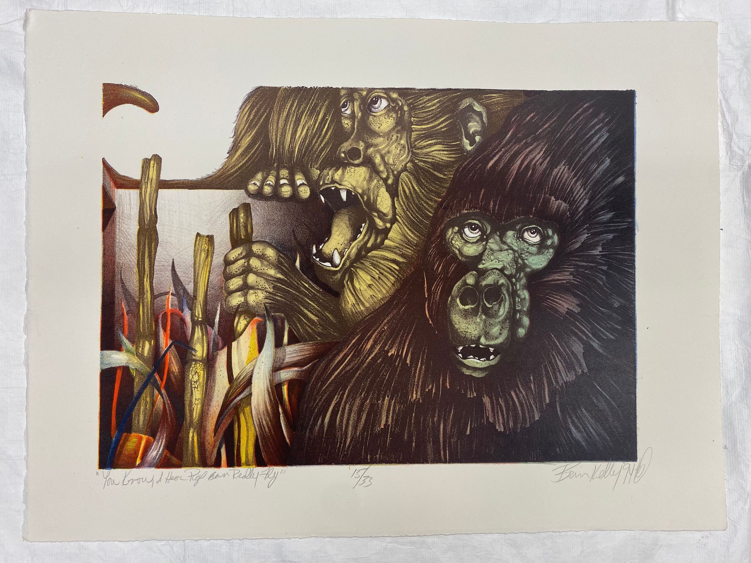 Large horizontally oriented lithograph of two large apes on cotton rag paper with deckled edges. The apes dominate the left proper of the print: a pastel and black one is turned toward the viewer with a yellow one in the background in profile with an open mouth. On the left, there is brightly colored plant life.Collection