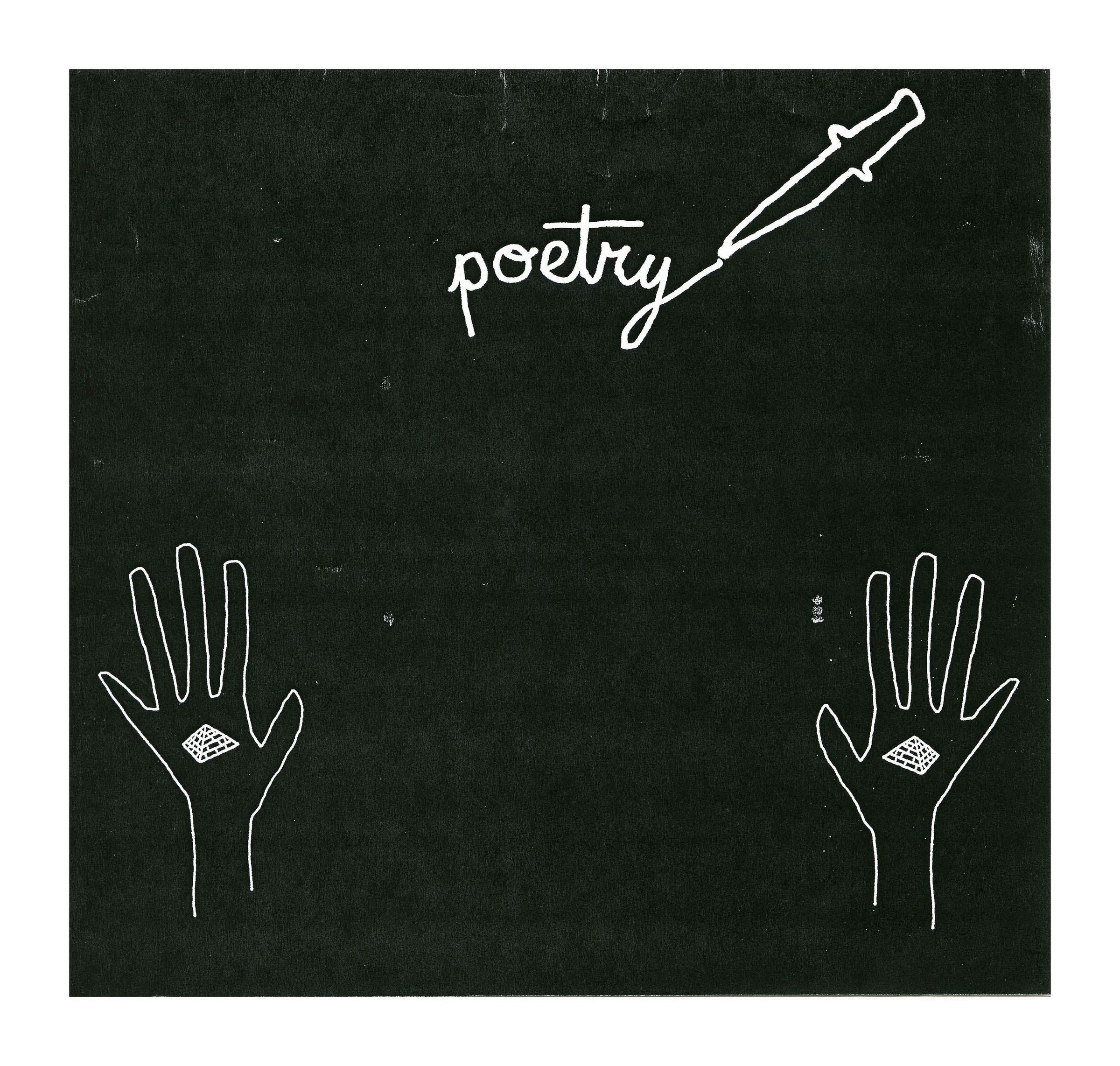 The front cover is black with white text and images of the word "poetry" and two hands with pyramids on them. The back cover is black with white text.Collection
