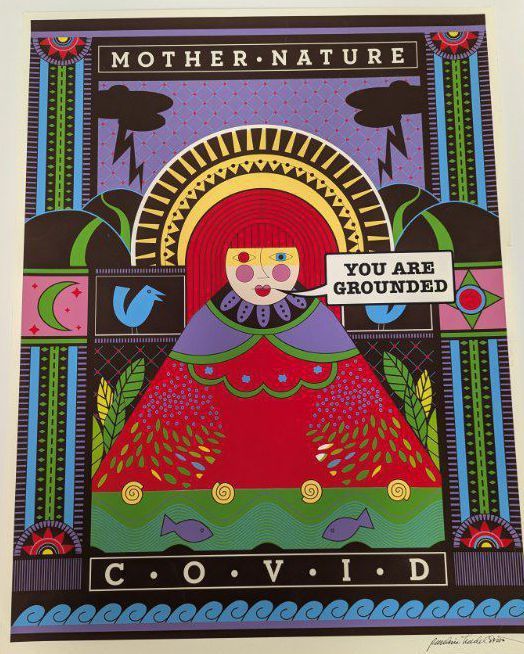 A Medium sized poster with a geometric representation of nature in the background and a geometric representation of a female figure. The figure has a speech bubble to the left of her face with the text "You are Grounded."Collection