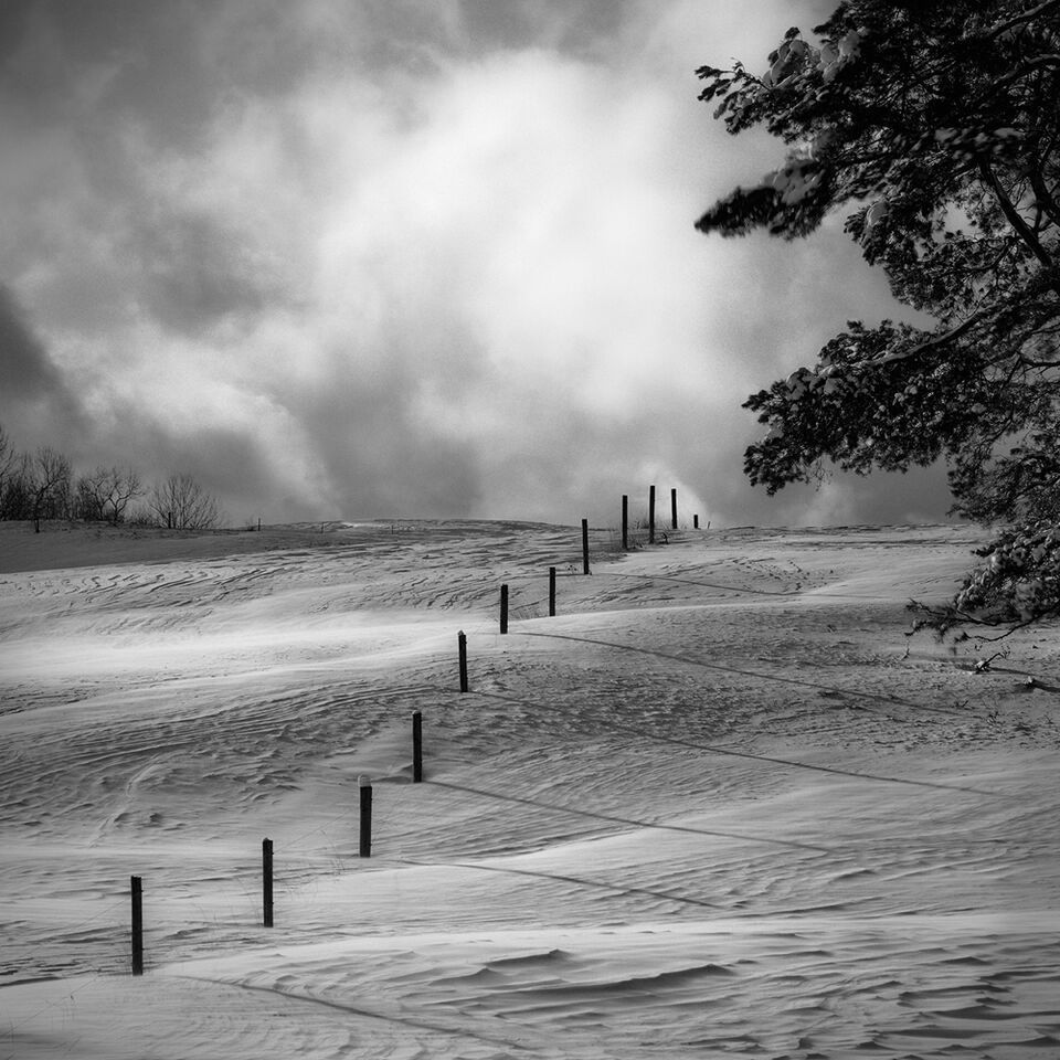 Black and White, Fence, Field, Landscape, Photograph, Winter, SnowDescription