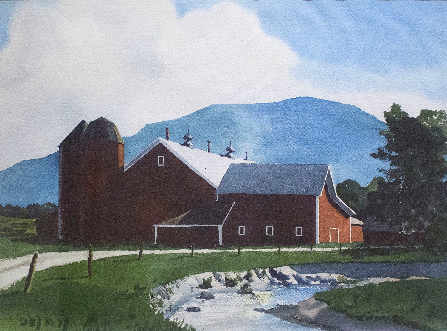 Barn, Farm, Green, Landscape, Red, RiverDescription