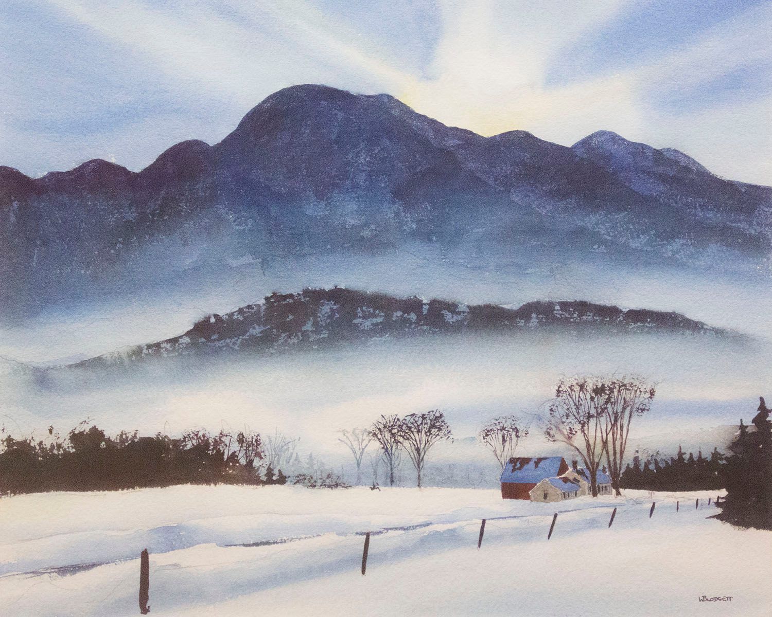 Winter mountain scene w/ distant farmhouse and fenceDimensions