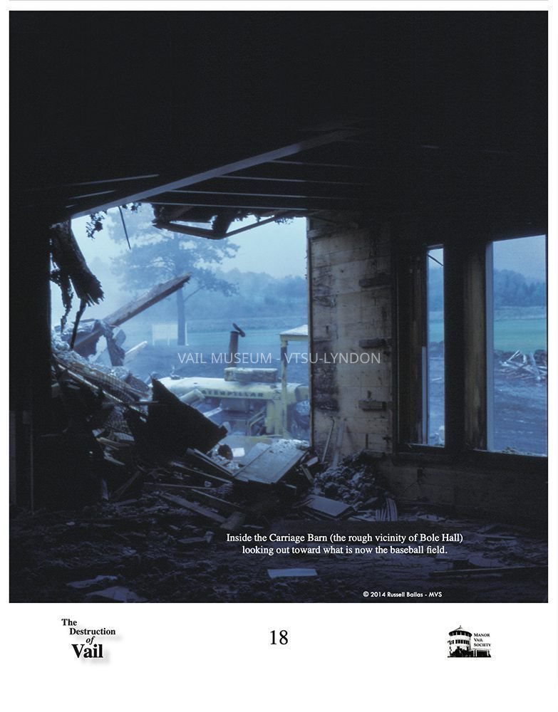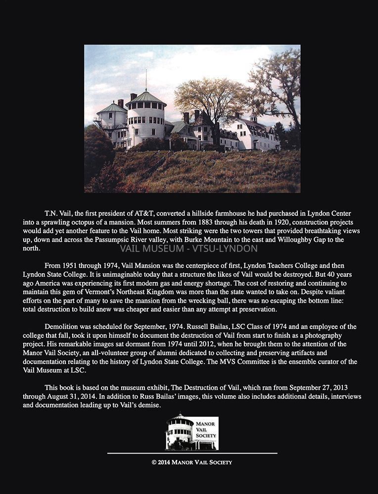 Book, The Destruction of Vail - End Of an Era, published by the Manor Vail Society, photographs by Russell Bailas, compiled, written and edited by Michael Thurston ’74, December 2014, in color, 11x 8 ½Cataloged By