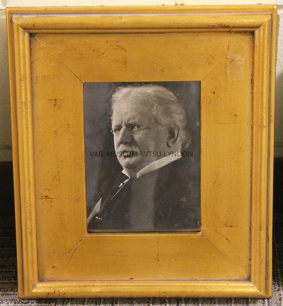Photo, framed in ornate gold color frame, silver gelatin print of Theodore N. Vail, donated by Jonathan Bouvee, with attached letter to President Joe BertolinoCataloged By