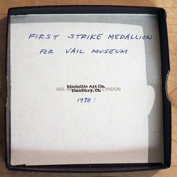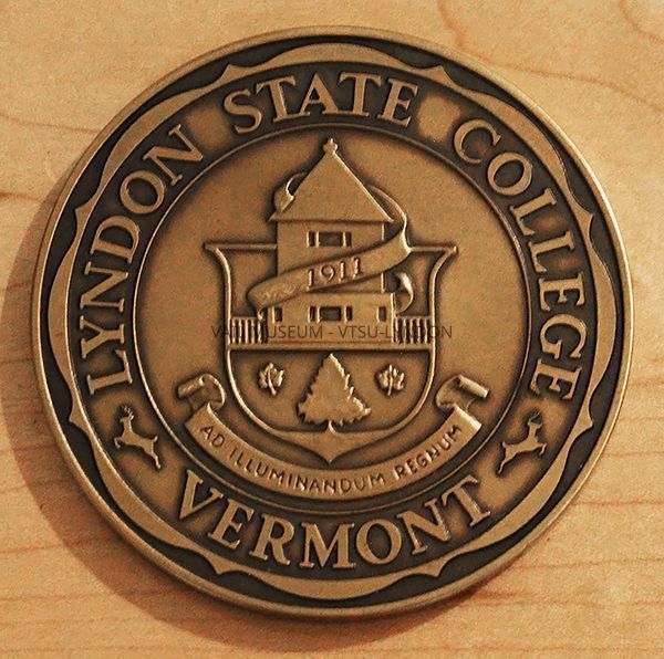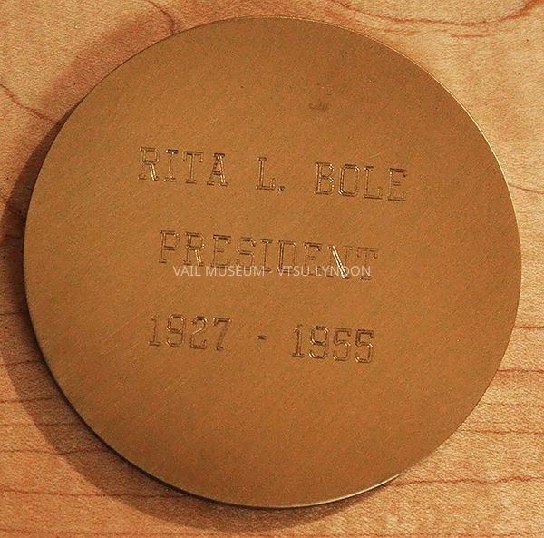 Medallion, Distinguished Alumni Award presented to Thelma Schoolcraft White, Lyndon State College imprint, brass, 3 inch diameter, with Rita L. Bole, President 1927-1955 engraved on the back; donated by her daughter, Constance White BeattieCataloged By