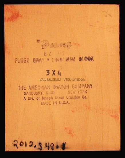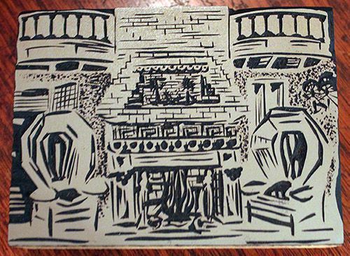 Photoengraving plate, hand-carved linoleum mounted on wood block: Vail’s hooded chairs by fireplaceCataloged By