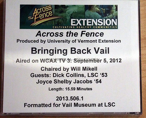 DVD, Across the Fence, Bringing Back Vail - TV episode featuring Dick Collins ’53 & Joyce Selby Jacobs ’54 discussing memories of Vail and the opening of Vail Museum in its new location at Lyndon State College.Context