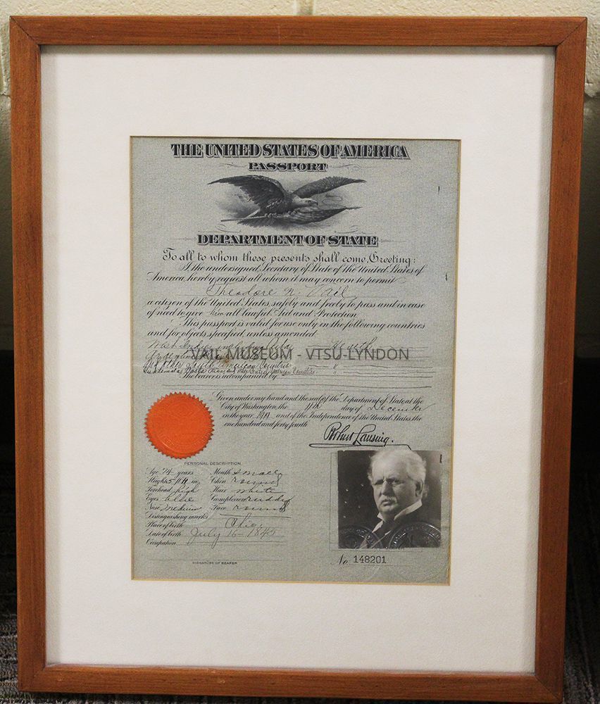 Passport, T.N. Vail’s Passport, issued 12/11/1919, signed by Secretary of State Robert Lansing, wood frame, 18 x 14 ½Cataloged By