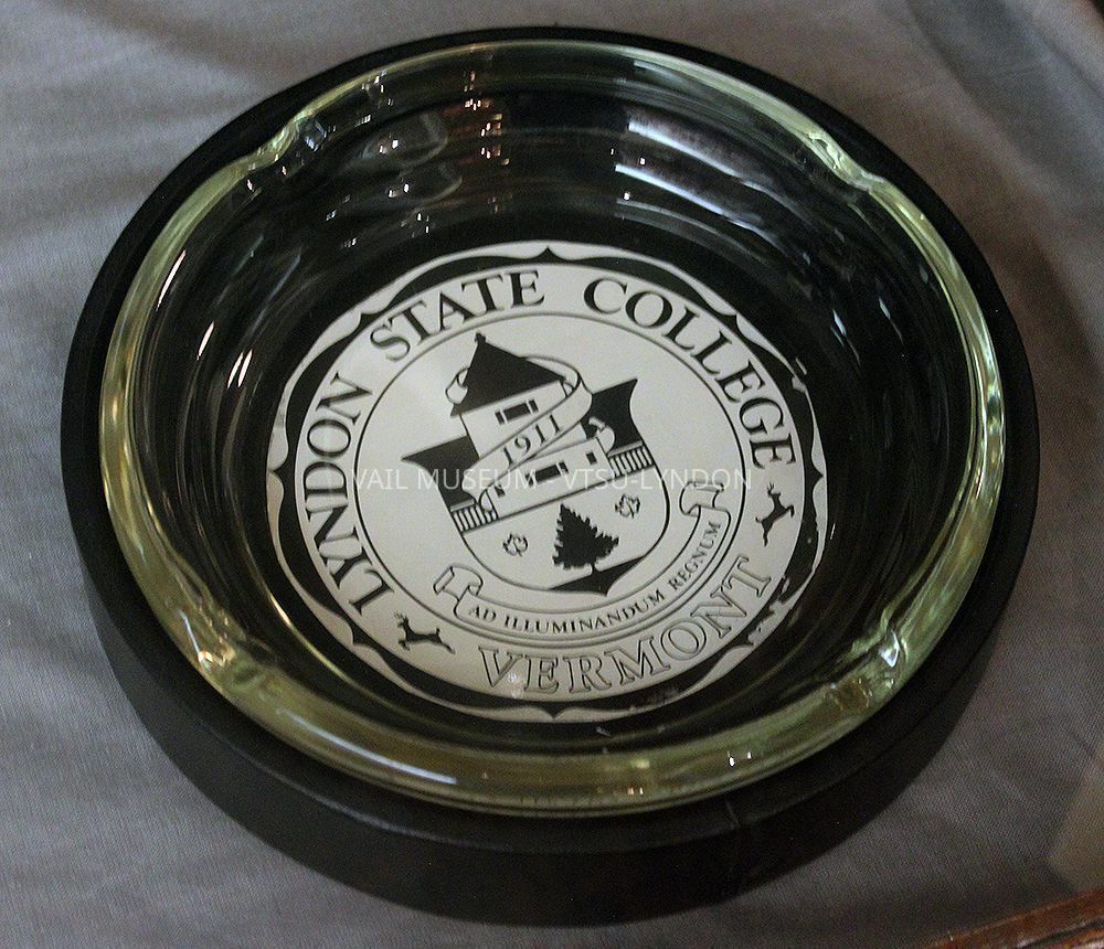 Ashtray, black, 8 inch diameter w/ glass Lyndon State College logo insert, located in trophy case