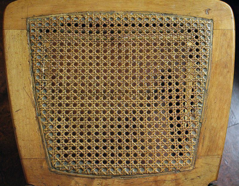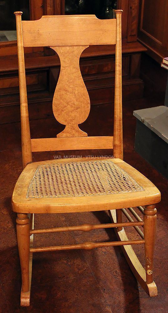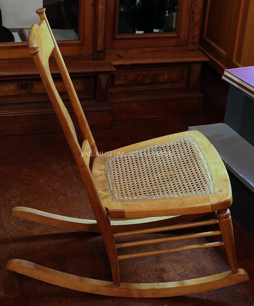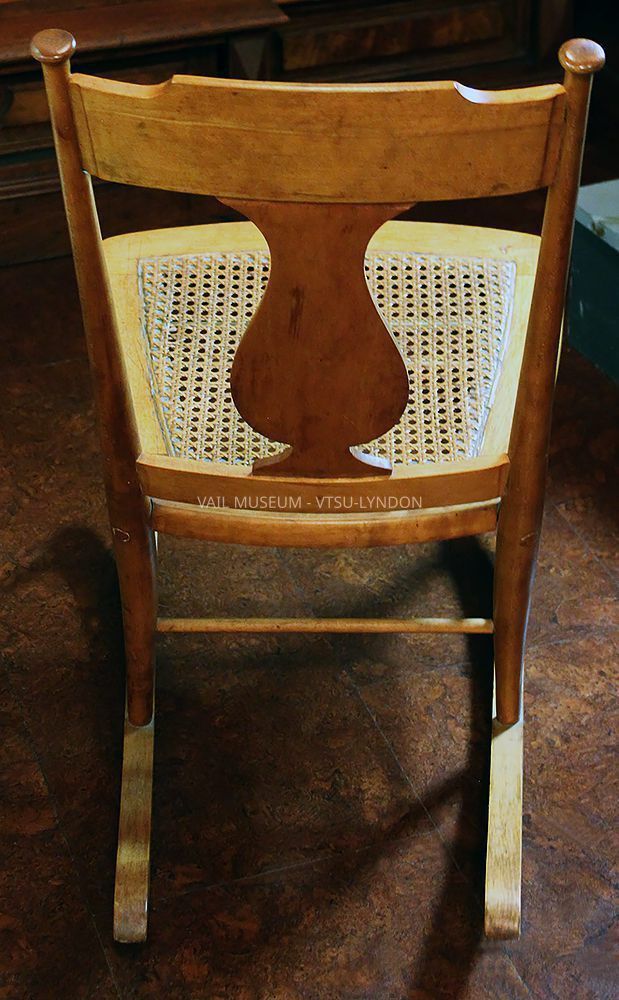 Rocking chair, small, curly maple, cane seat, leg repaired. Discarded from Vail’s collection during a summer cleanup and rescued by Gene Holzwarth, LSC class 1985, donated by his wife Joan Pond Holzwarth in her husband’s memoryContext